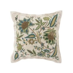 Visual Details: This cushion features a rich tapestry of birds, flowers, and vines rendered in vibrant cotton threads. The multi-colored embroidery sits beautifully against a neutral cream background, highlighted by handmade French knots that add depth and tactile interest. The base is crafted from natural cotton slub, characterized by unique knots and thicker raised threads that emphasize its organic, handcrafted origin.