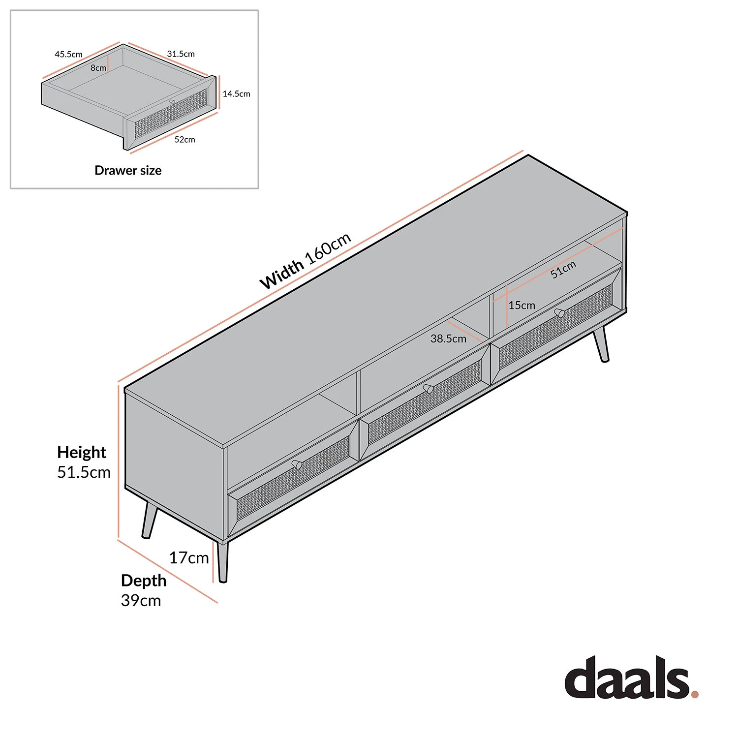 - Dimensions: W 160 x D 39 x H 51.5 cm