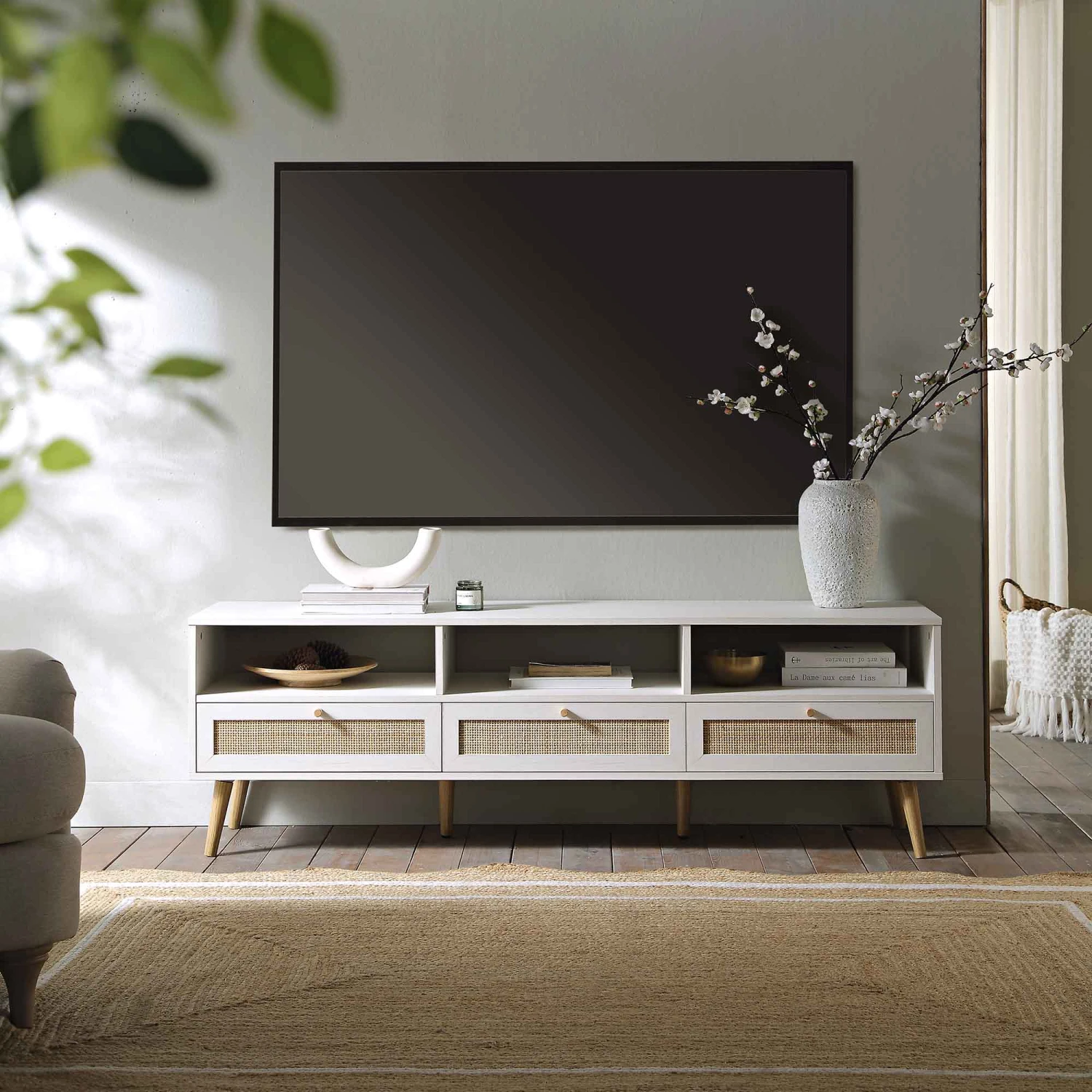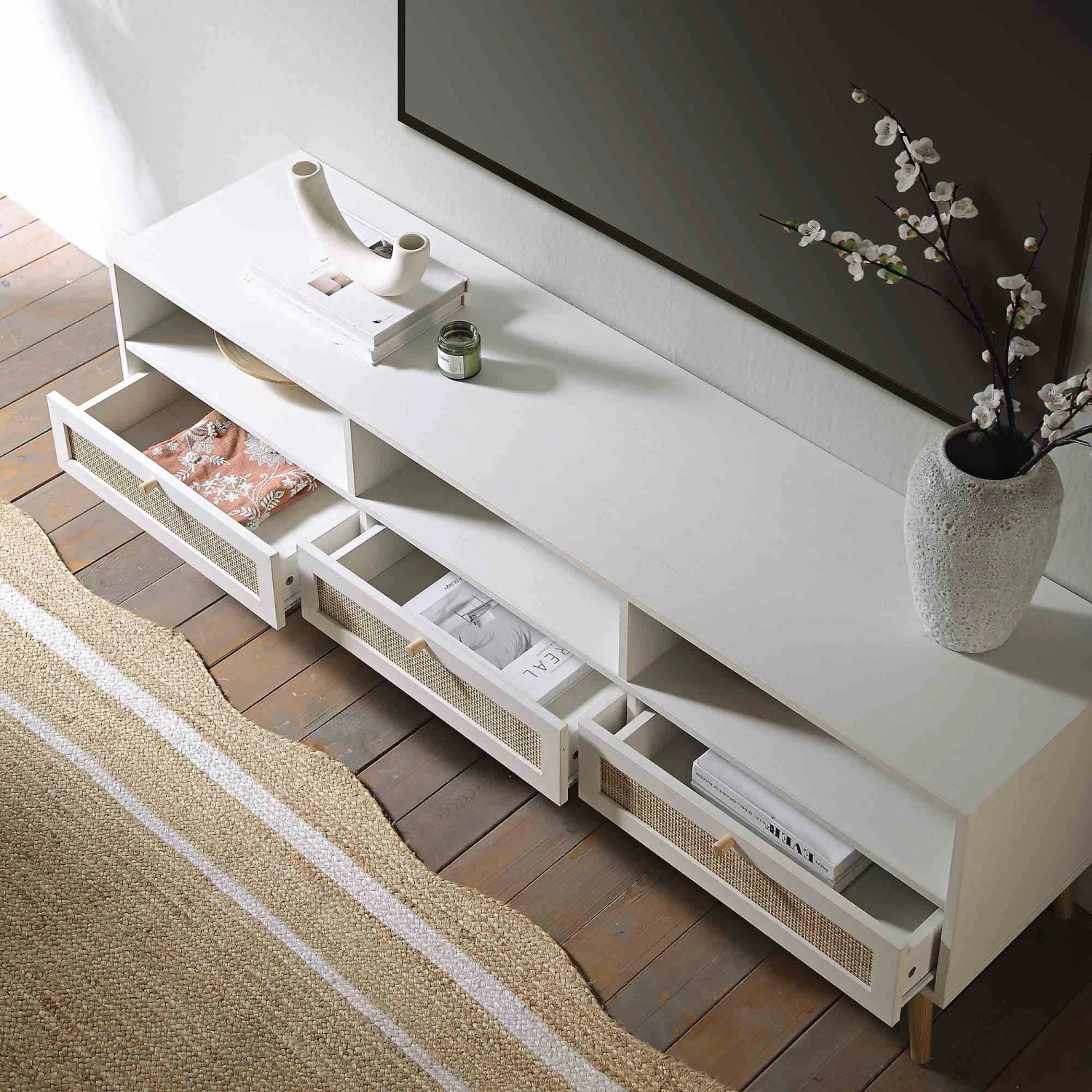 Our Frances TV stand offers the perfect blend of bohemian texture and Scandinavian minimalism. Designed to be the centerpiece of your lounge, this 160cm unit effortlessly balances functional storage with high-end visual appeal, featuring a distressed washed white finish that highlights the natural beauty of the wood grain.