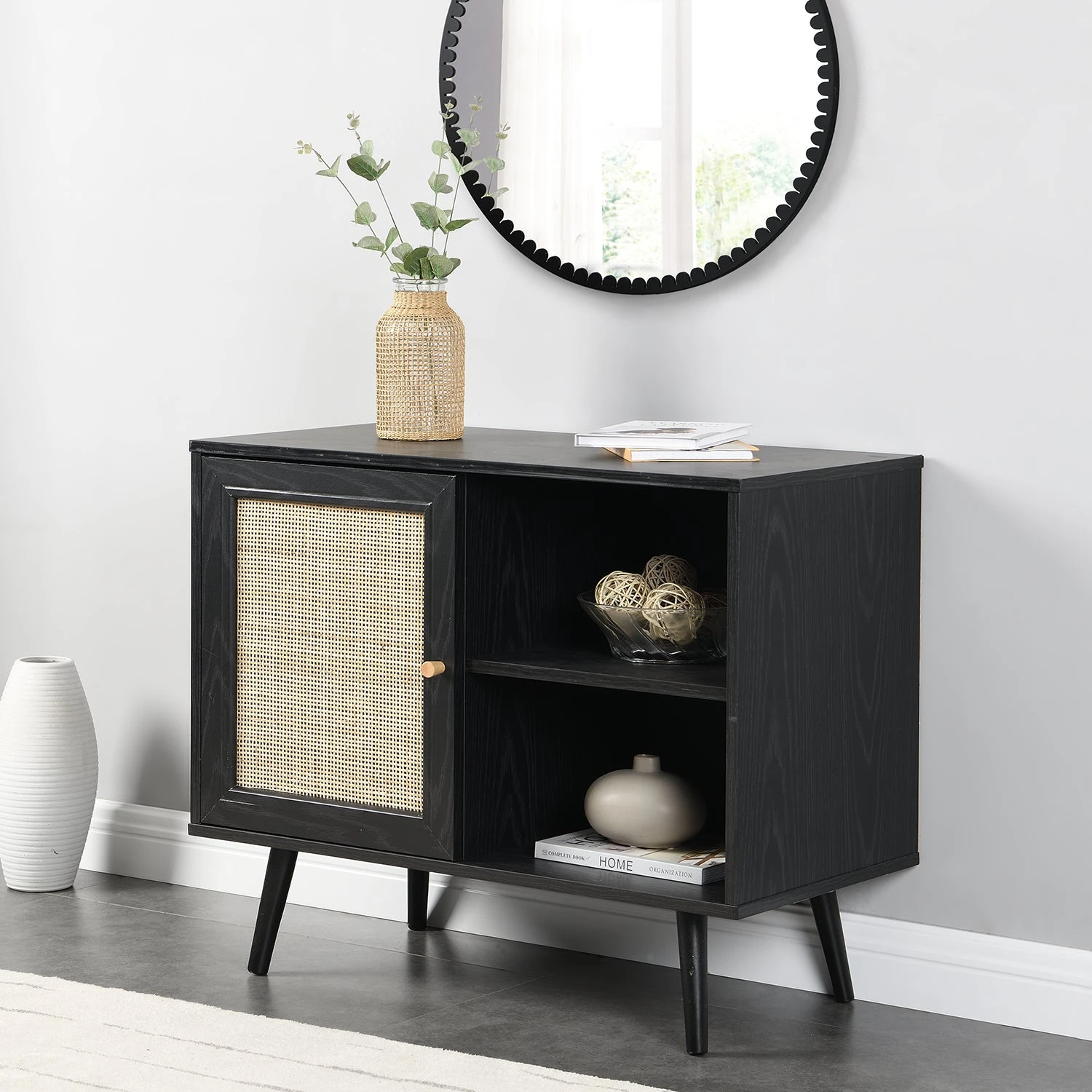 The Frances 1-door cabinet is a stunning fusion of contemporary black framing and traditional hand-woven natural rattan textures. Designed to provide both hidden storage and open display space, this versatile sideboard brings a sophisticated, airy feel to any lounge, hallway, or bedroom.