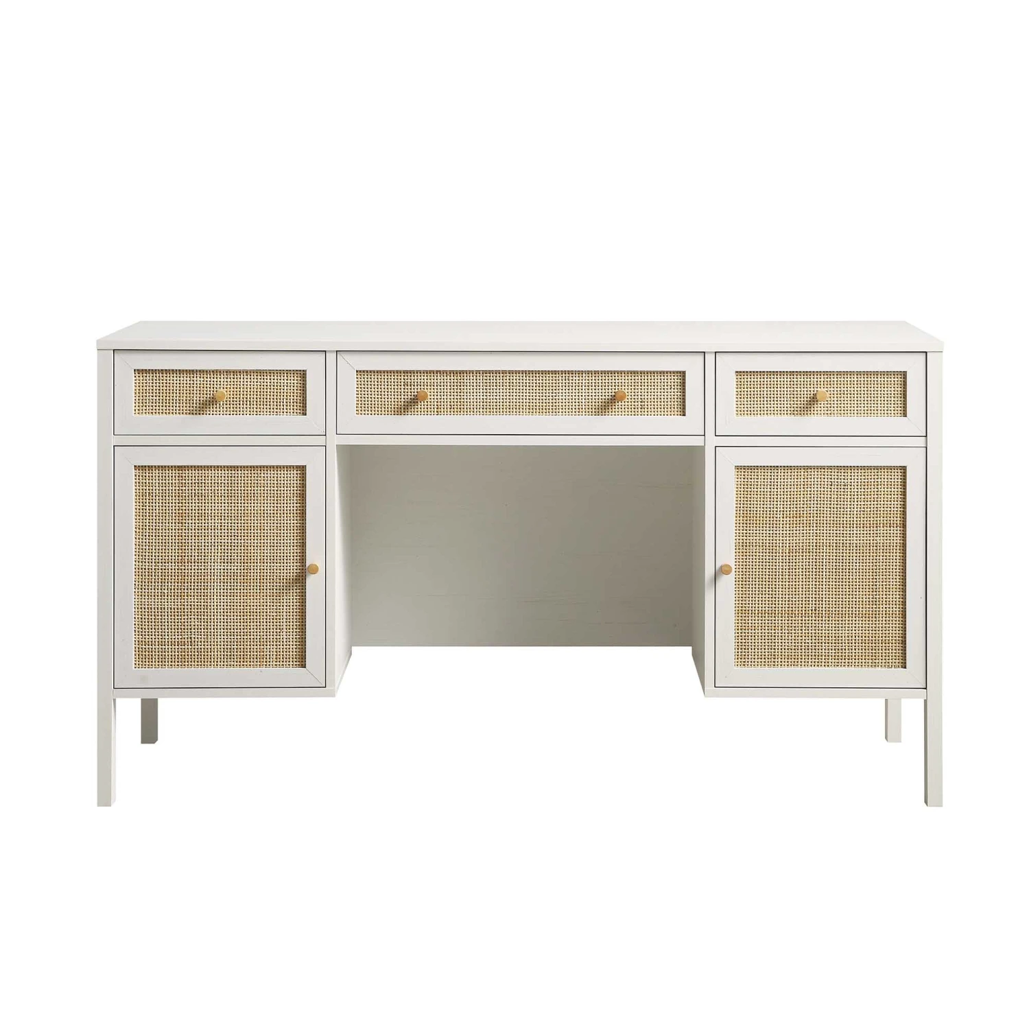 - Hand woven natural rattan inserts on the drawer cupboard doors coordinate with solid wood handle and legs.