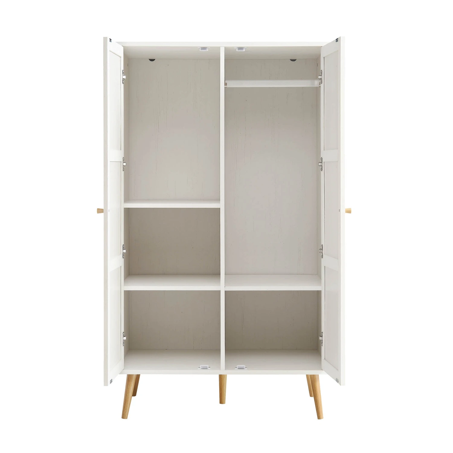 - Hand woven natural rattan on the wardrobe doors coordinate with solid wood door handles.