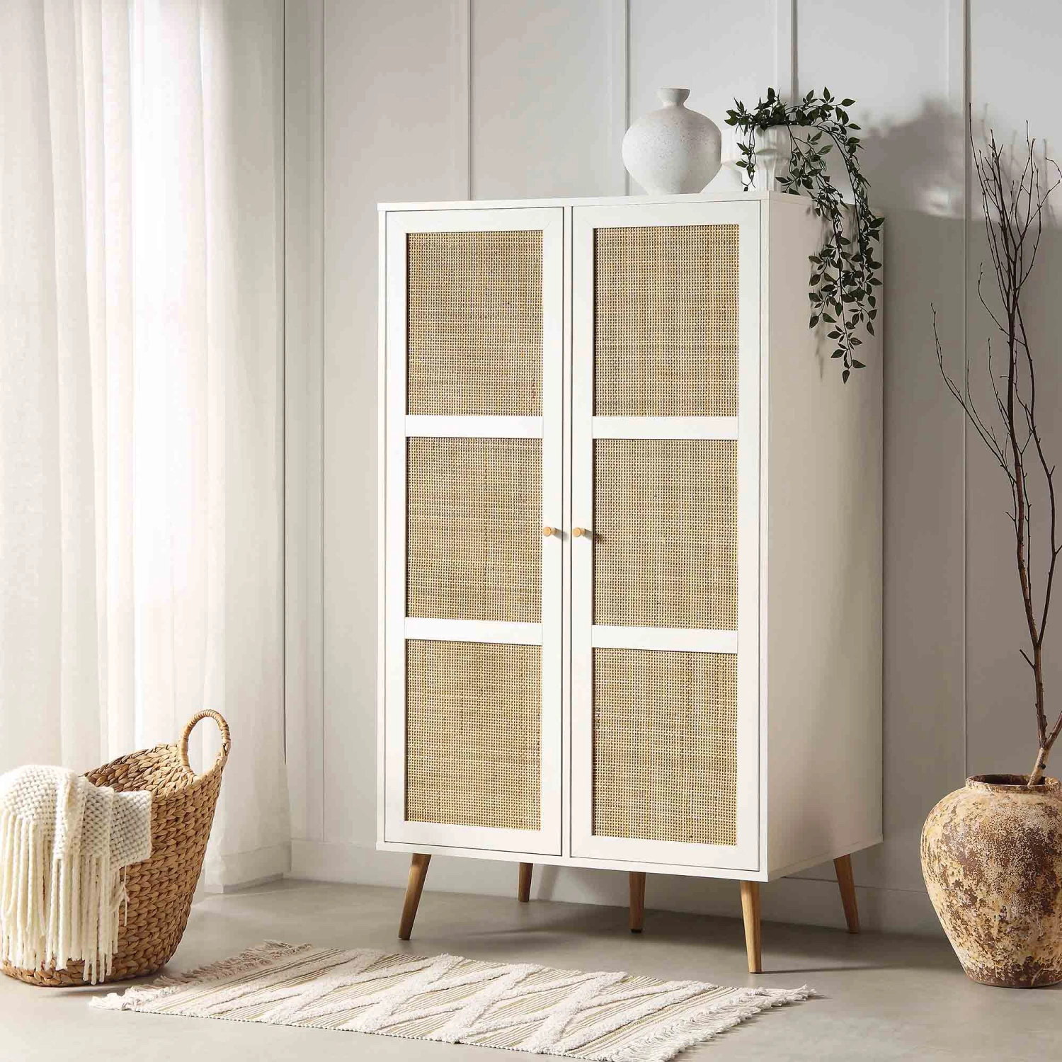- Crafted from wood and natural rattan, our Frances Woven Rattan Small Wardrobe adds a bohemian vibe to your room and will give you the perfect solution for any extra storage space you may need