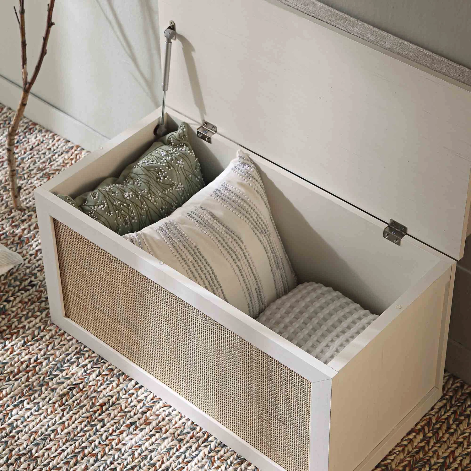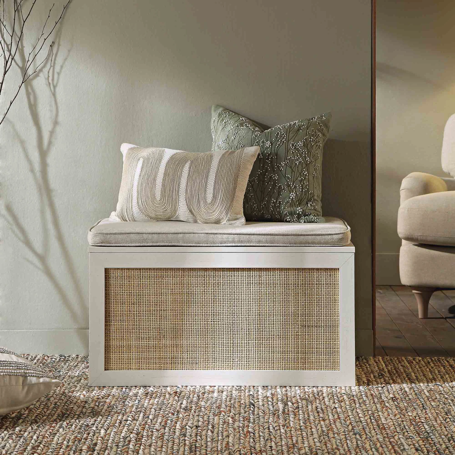 - The natural woven rattan fronts are complemented by oatmeal fabric cushion.