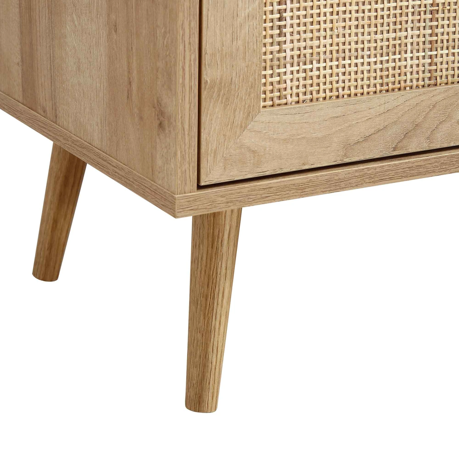 - Hand woven natural rattan inserts on the cabinet door coordinate with solid wood handle and legs to create a cosy, earthy look.