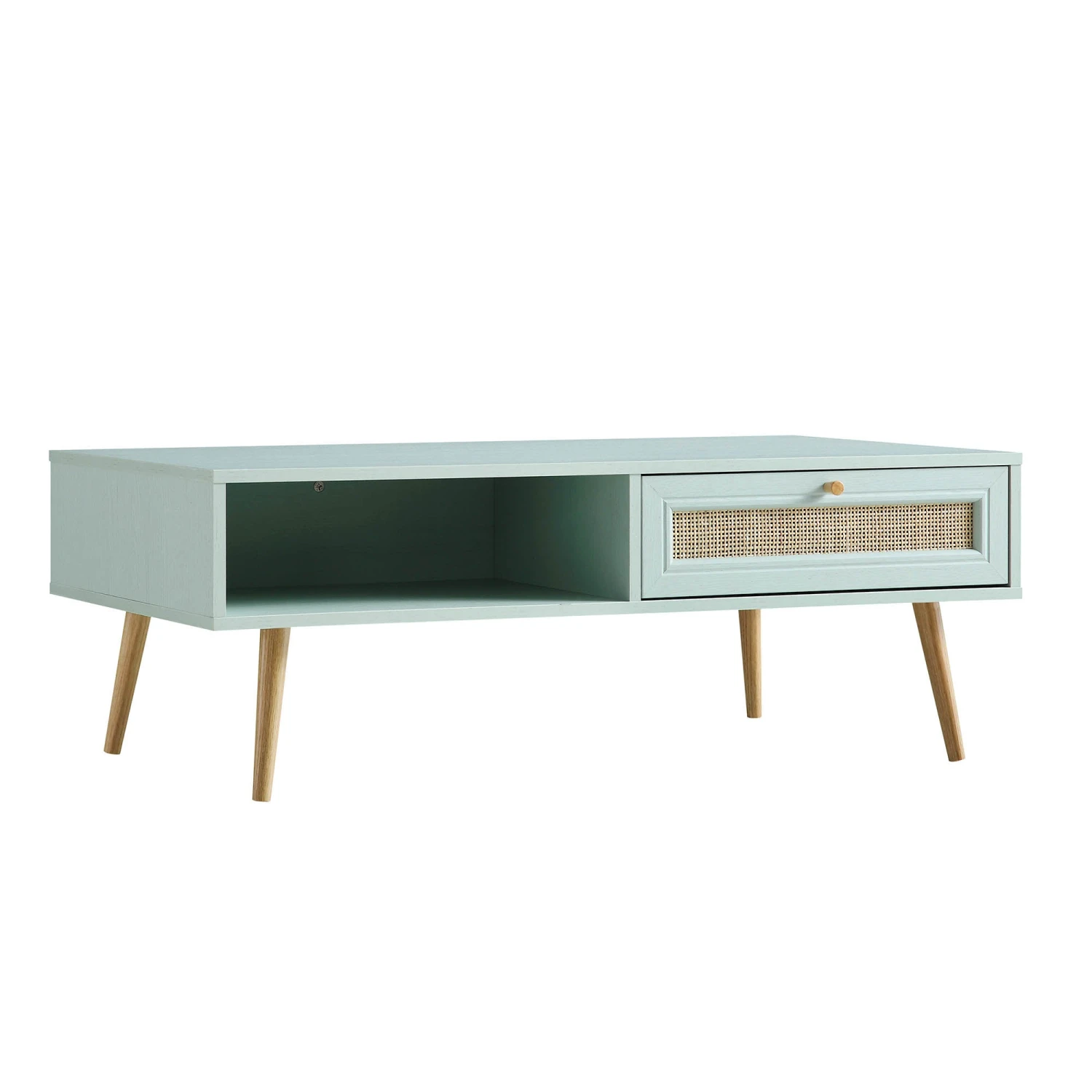 - Theย coffee table offers 1 sliding drawer and 1 open shelf for storage.