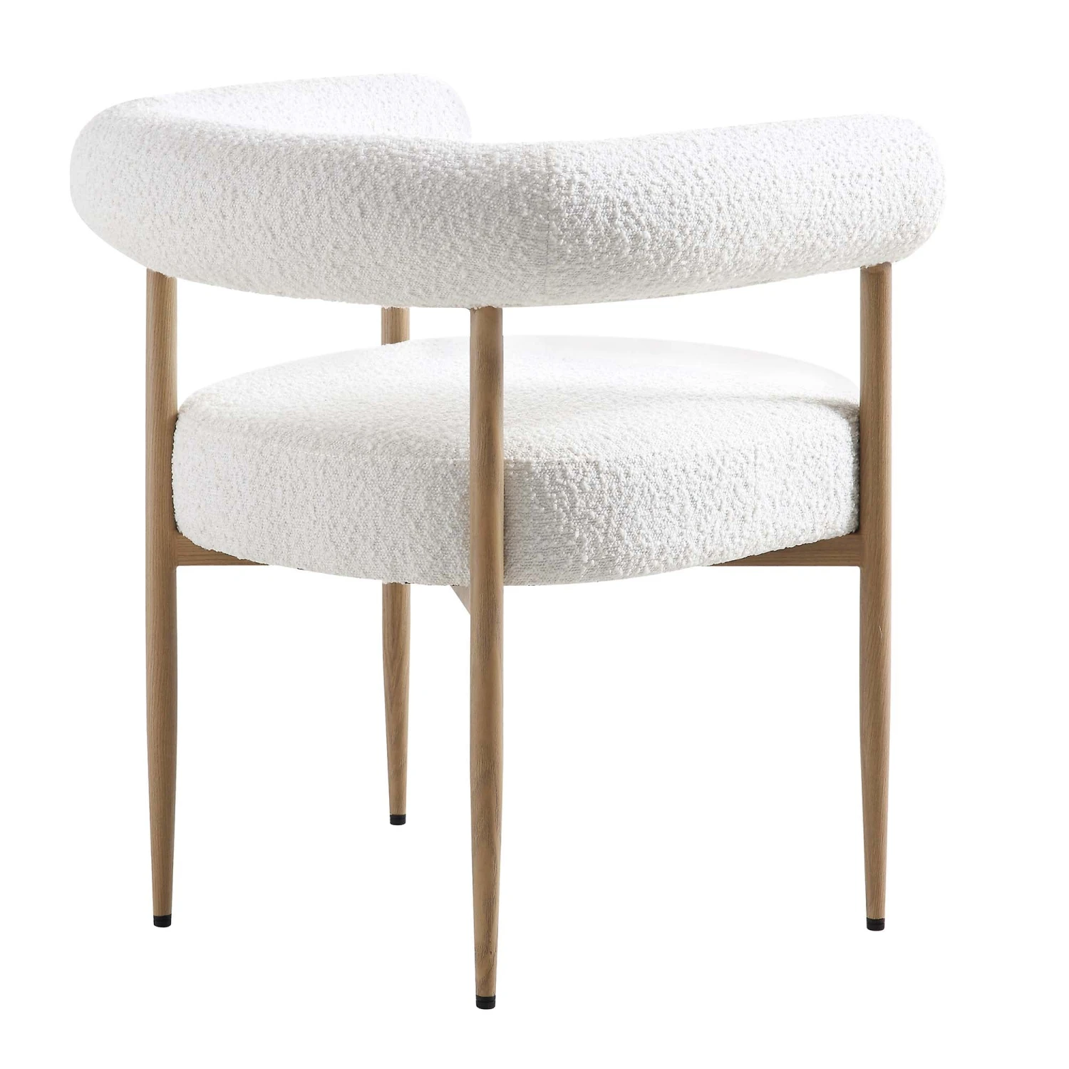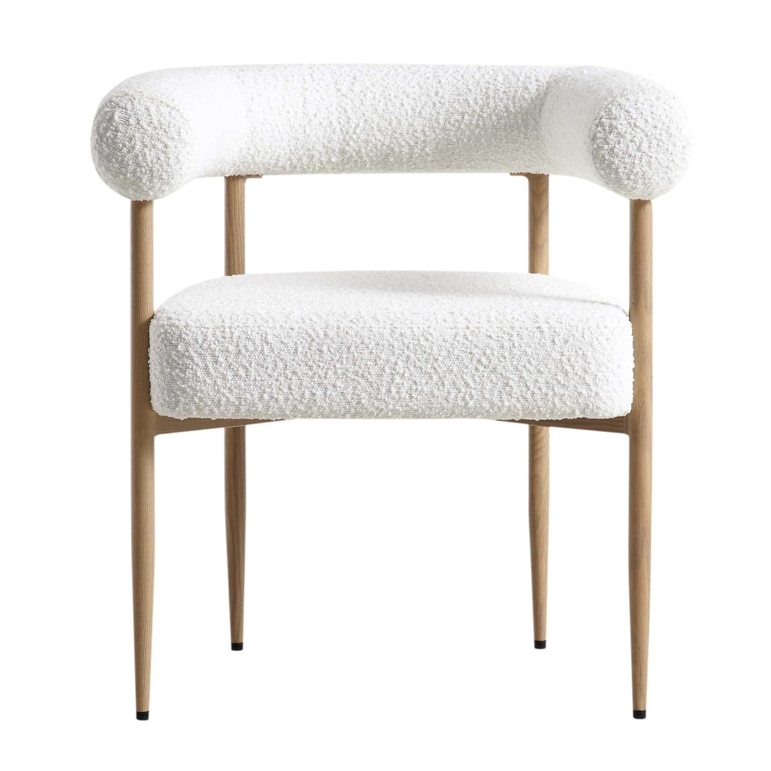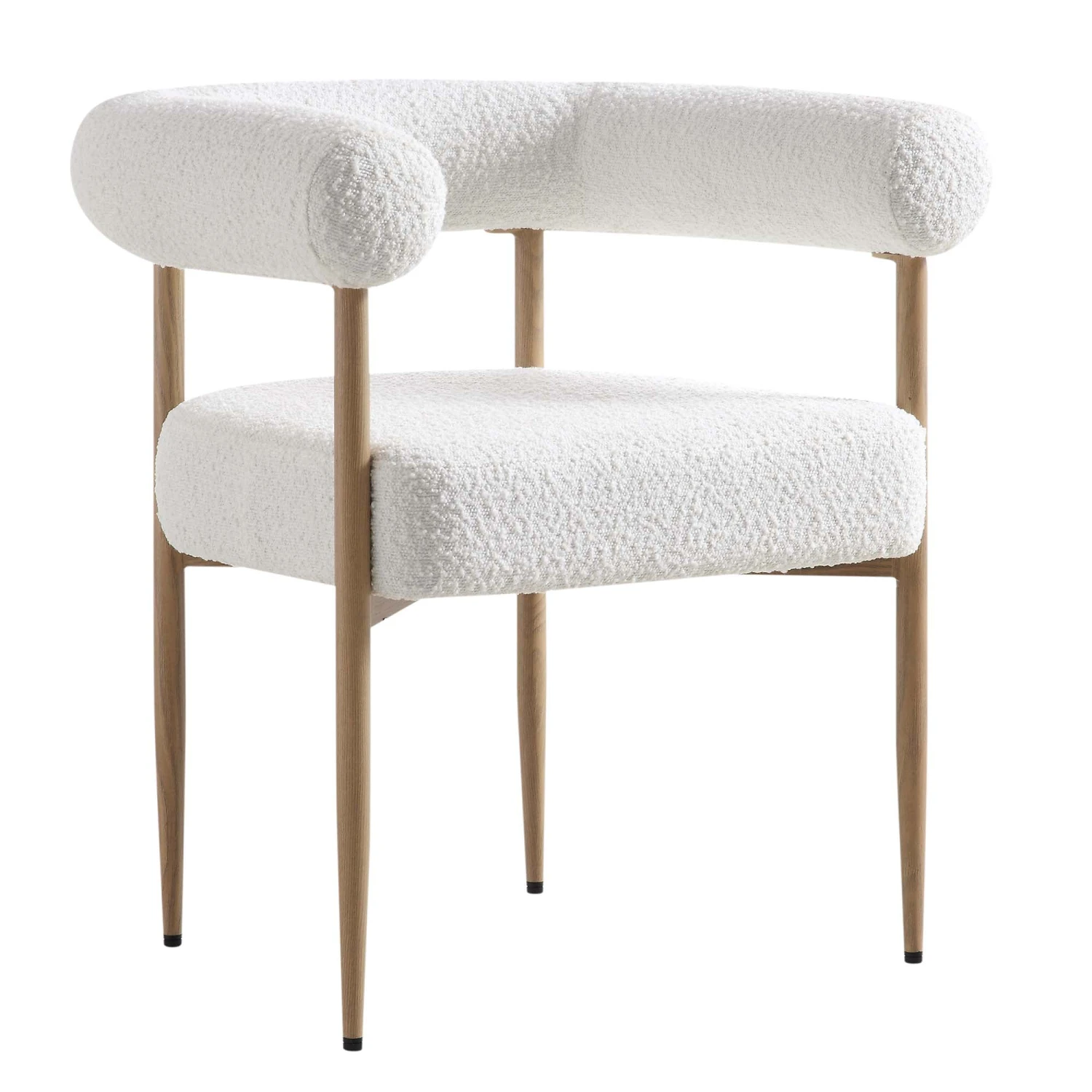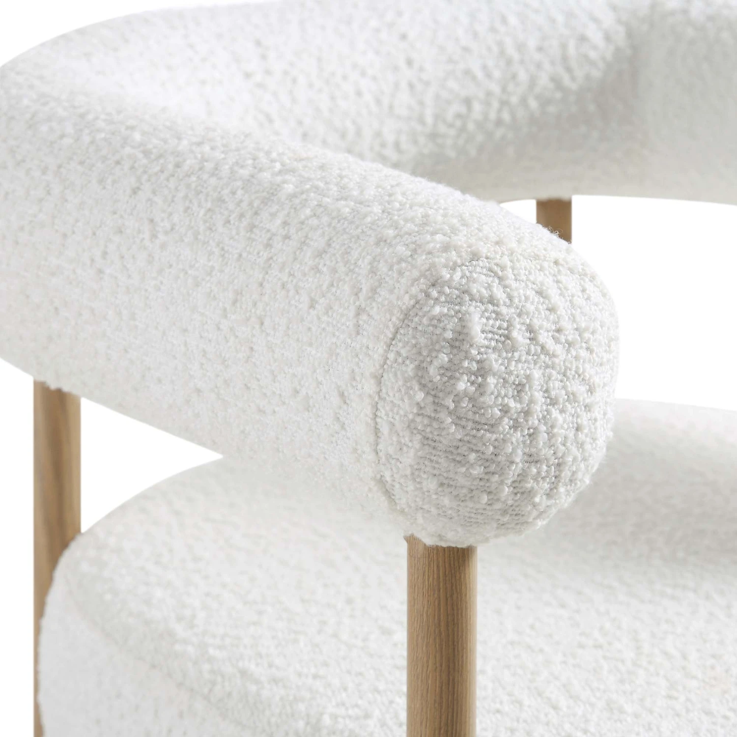 The Fulbourn White Boucle Dining Chair is a cheerful and sophisticated addition to any modern home. Combining high-end aesthetics with plush comfort, this chair features a unique tubular cushion design that seamlessly integrates the backrest and arms for a cocooning feel. The luxurious white bouclé upholstery provides a rich, tactile experience, perfectly contrasted by sleek, tapered legs with a natural wood effect finish.