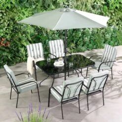 Champneys 6-Seater Steel And Fabric Outdoor Patio Dining Set With Crank Parasol, Sage Green