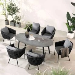 Montebello 6-Seater Outdoor Black Rope And Aluminium Oval Dining Set With Grey Ceramic Dining Table