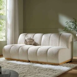 - Upholstered with beautiful ecru boucle fabric, the sofa modules are mounted on natural solid wood bases.