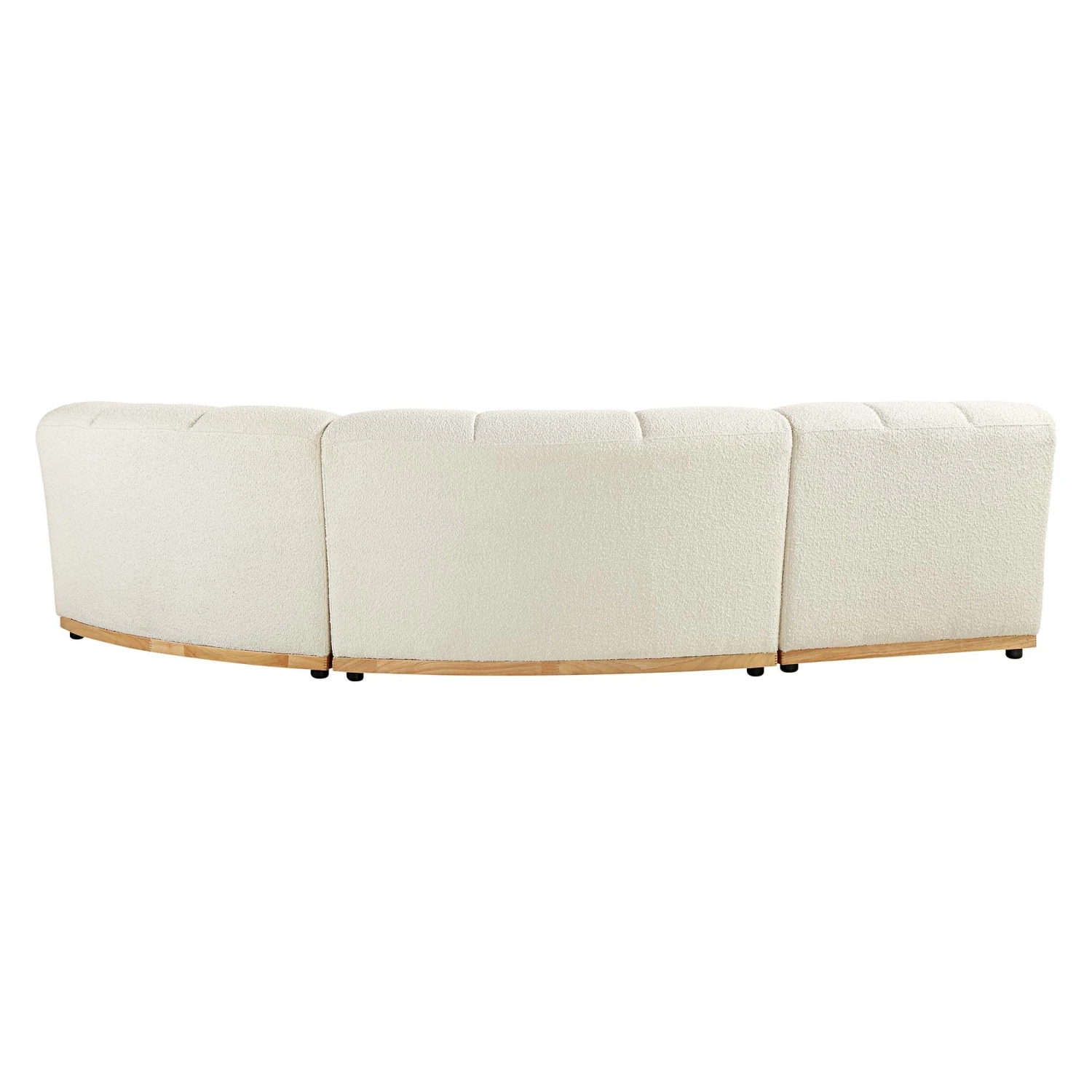 - Upholstered with beautiful ecru boucle fabric, the sofa modules are mounted on natural solid wood bases.