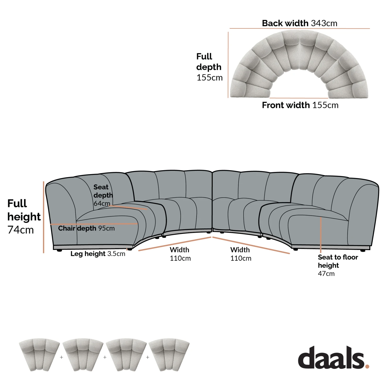 - 4-Seater curved sofa (half circle) module size: Wย 343 x D 170 x Hย 74 cm.ย