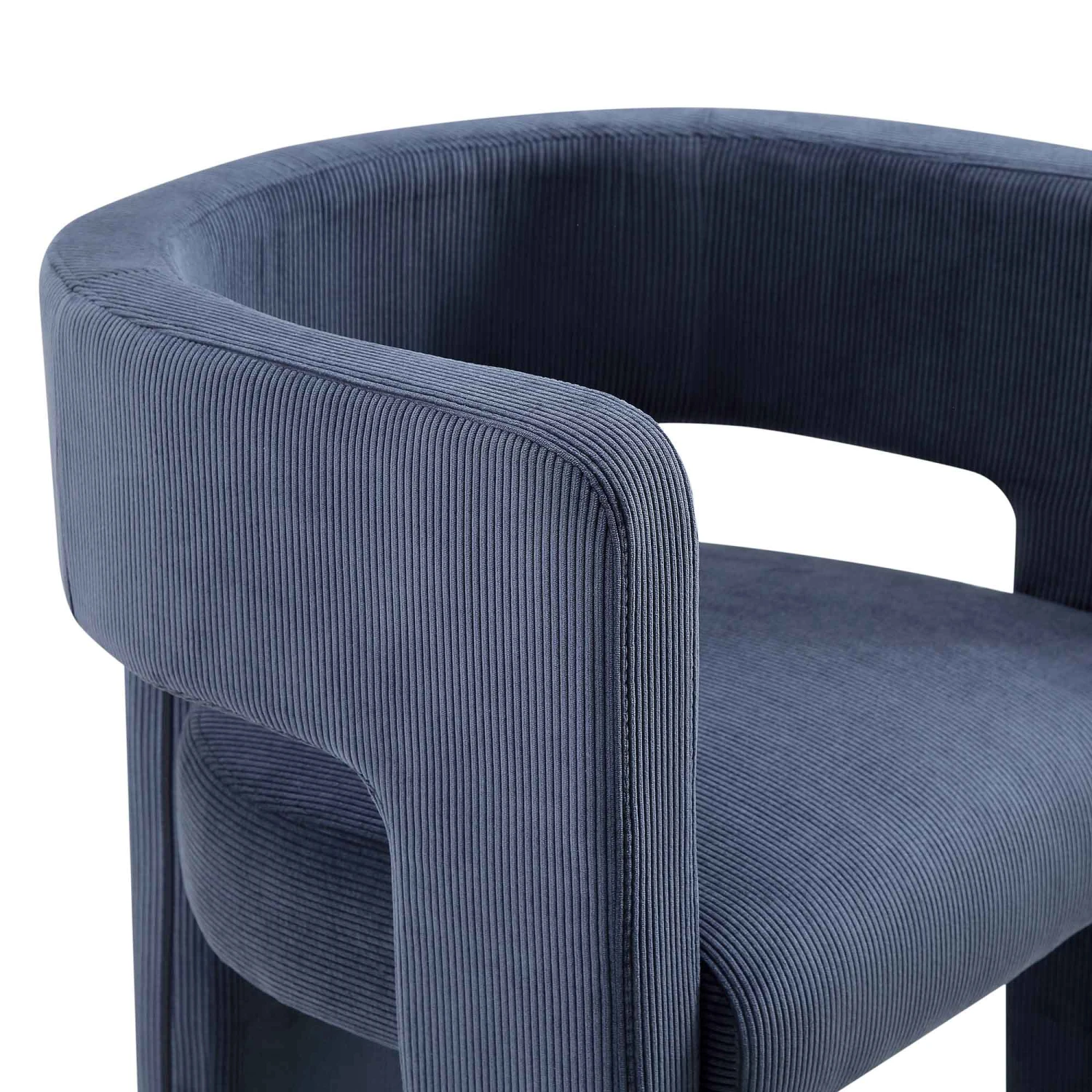 - Well-cushioned seat and lovely corduroy fabric upholstery in denim blue shade.