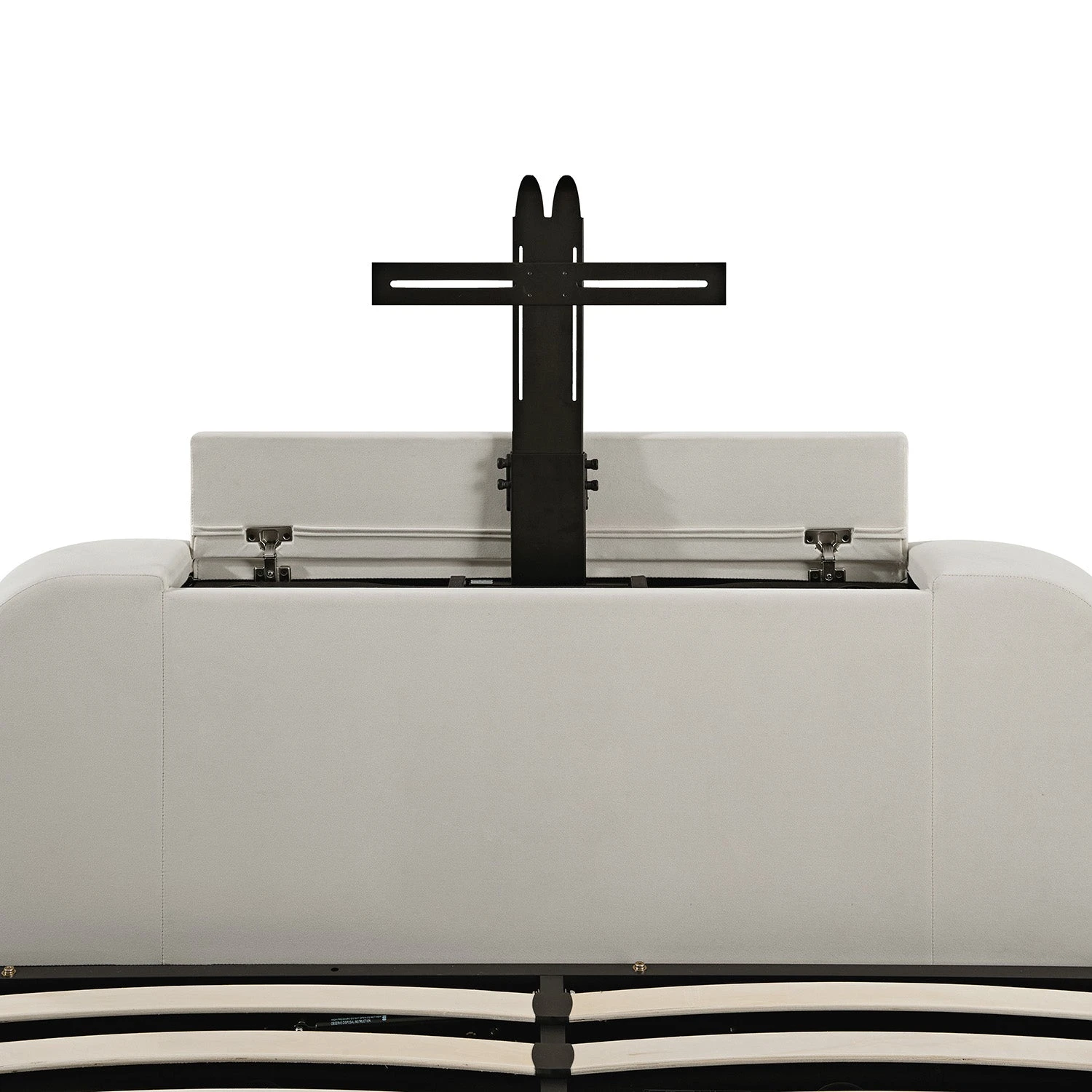 - At the touch of a remote summary, the integrated TV lift at the foot of the bed smoothly reveals space for your television, letting you enjoy movie nights or lazy mornings in bed without compromising on style.