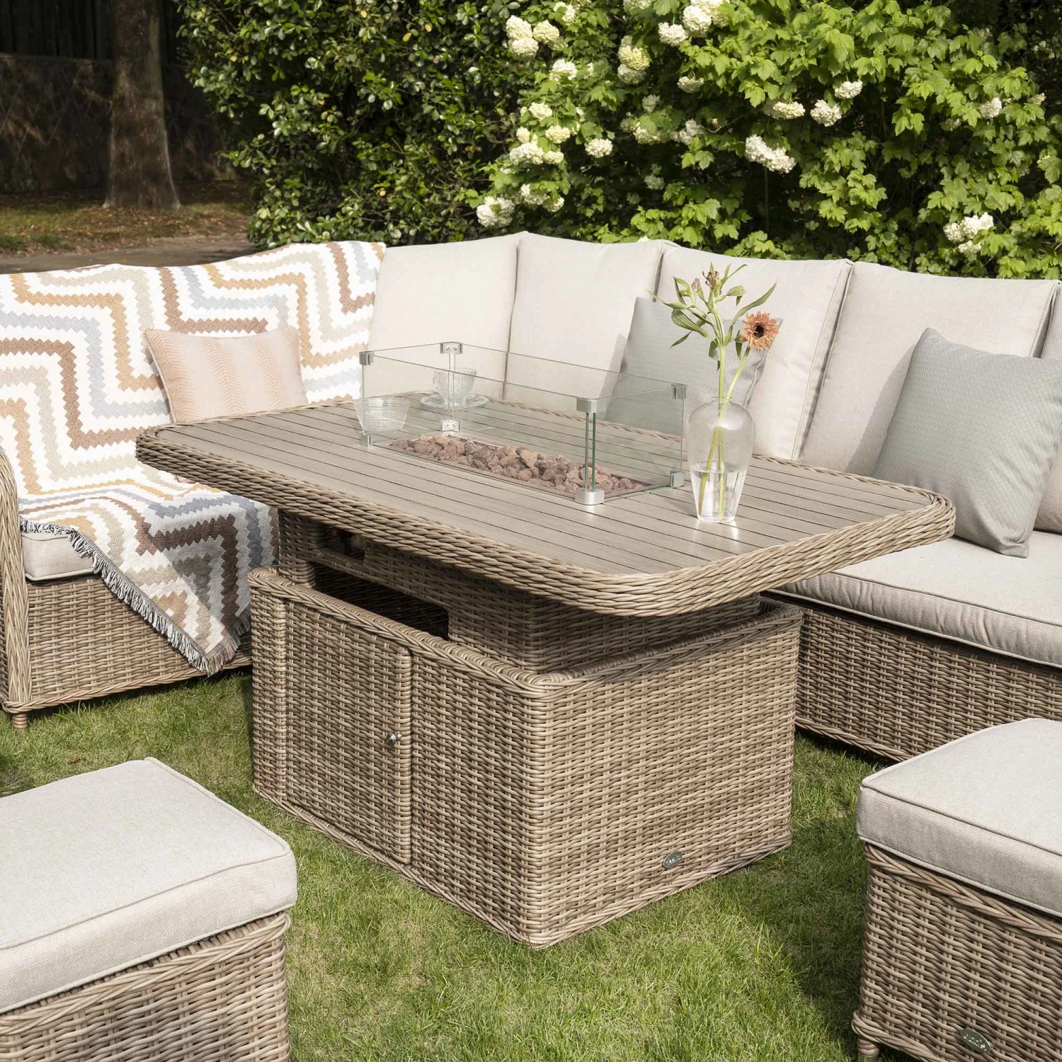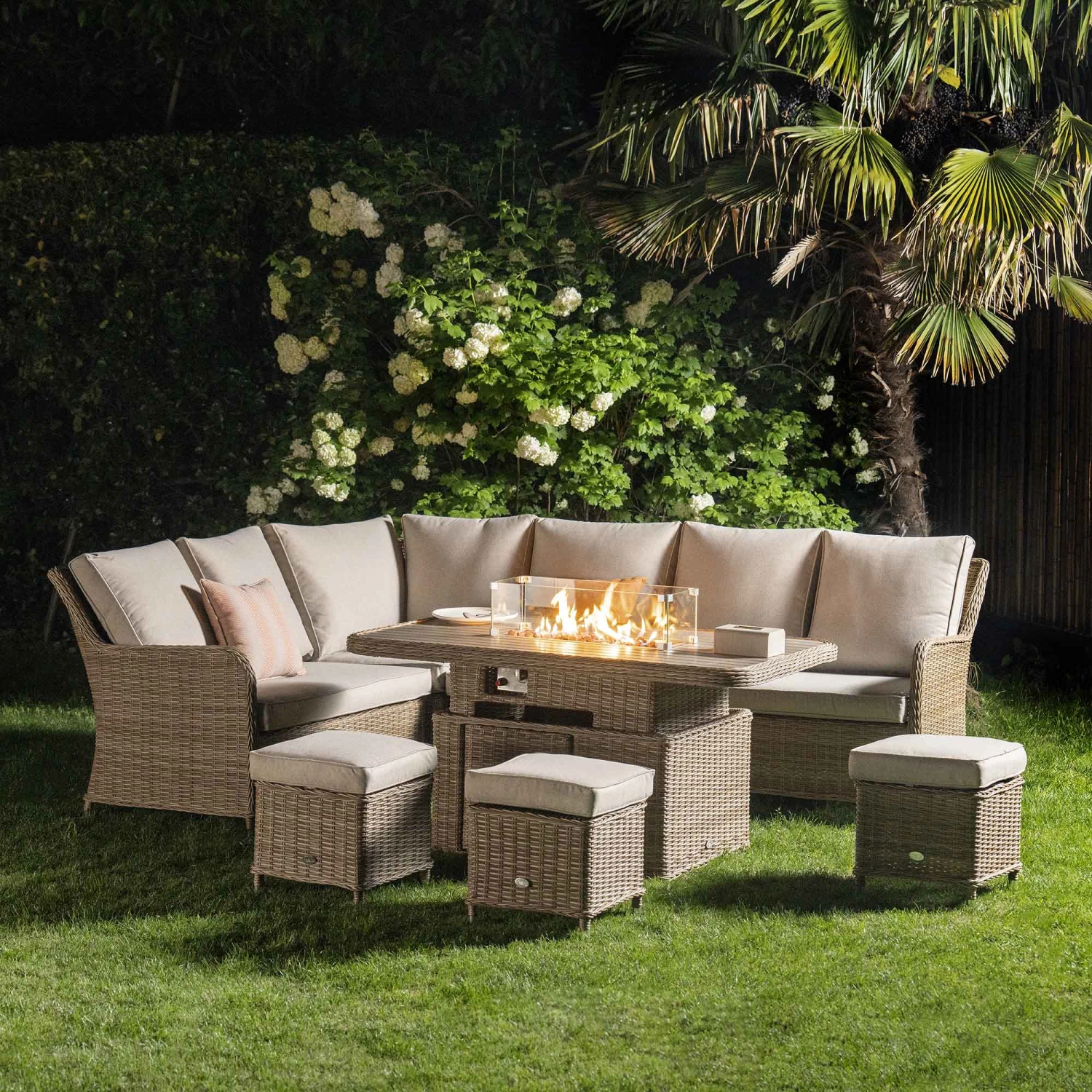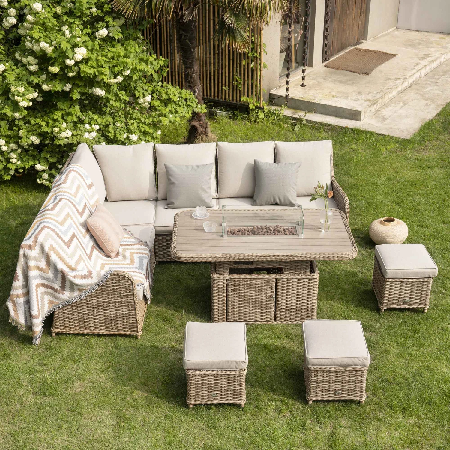 Transform your patio into a high-end retreat with the Hampshire Large Corner Casual Dining Set. This modular masterpiece combines the rustic charm of natural wicker with the modern convenience of a dual-height firepit table, ensuring your garden is the go-to spot for both afternoon lounging and evening dinner parties.