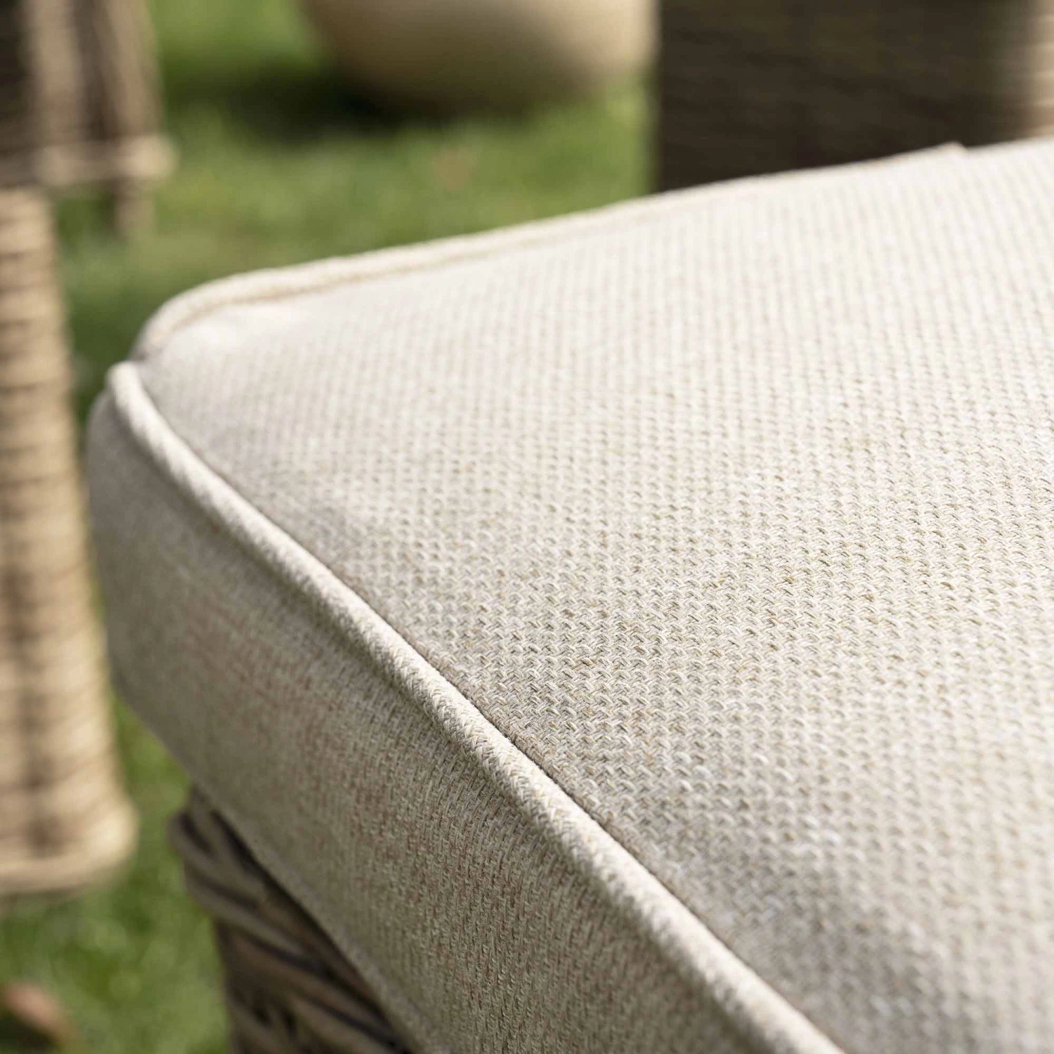 Crafted with a sophisticated natural colorway, the 8mm round and half-round PE wicker offers a multi-tonal texture that mimics real rattan while providing superior weather resistance. The set is paired with plush, deep-filled beige cushions that feature refined piping, creating a soft, inviting contrast against the structured wicker frames. The central rising table features industrial-grade aluminium slats and an integrated firepit, offering a sleek, functional focal point.