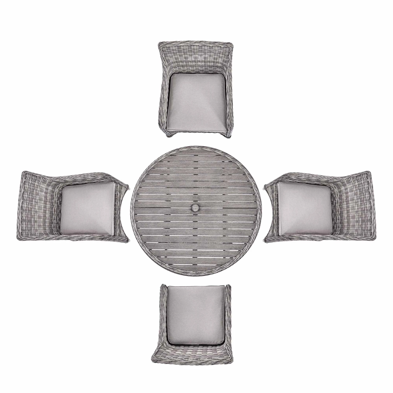 This set features a premium light grey weave, utilizing a sophisticated mix of round and half-round PE wicker for a multi-tonal, high-end finish. The centerpiece is a spacious round dining table uniquely topped with sturdy aluminum slats finished in a realistic wood effect, providing the warmth of timber with the durability of metal. Matching the weave, the four armchairs come with plush, light grey 100% polyester cushions for ultimate comfort.