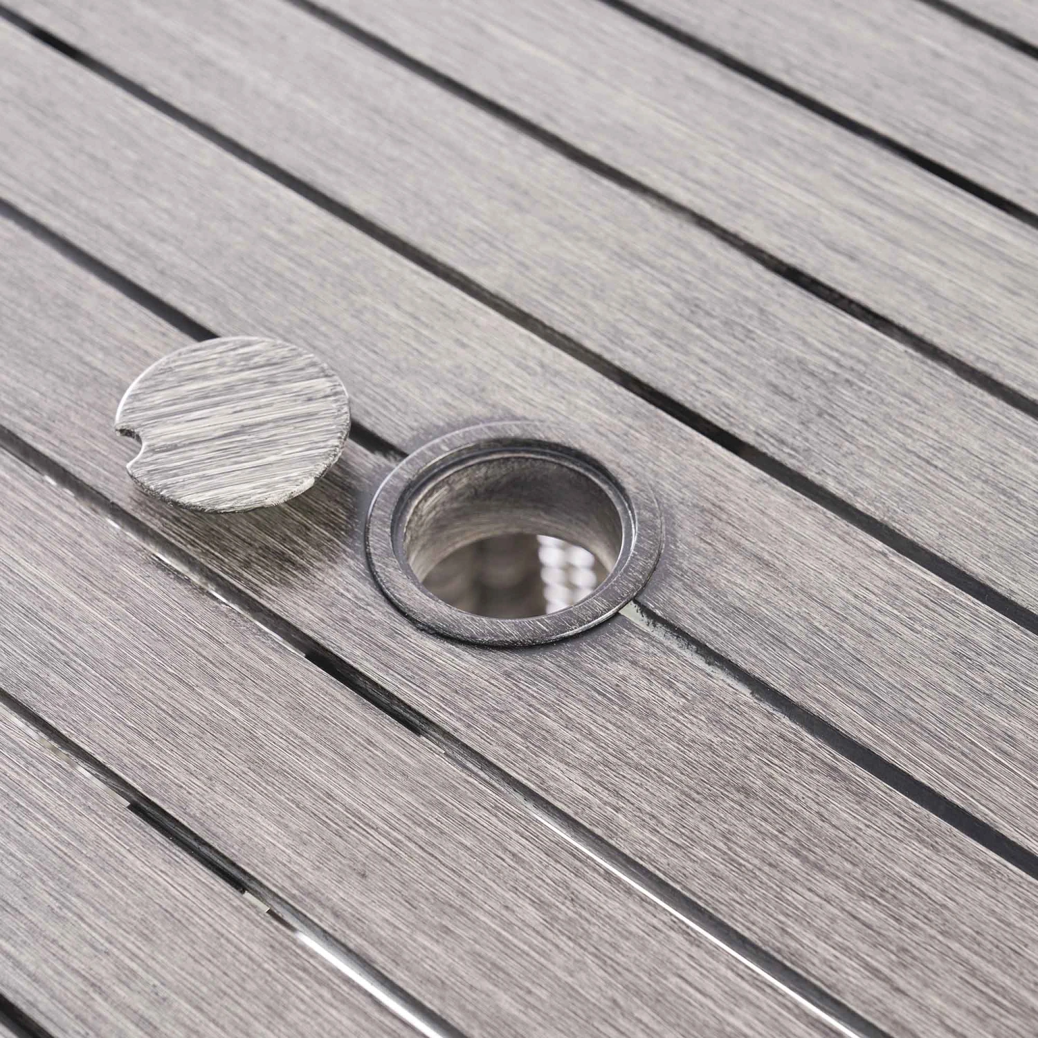 - Practical Elegance: The wood-effect table top is easy to clean and includes a central parasol hole for those bright sunny days.