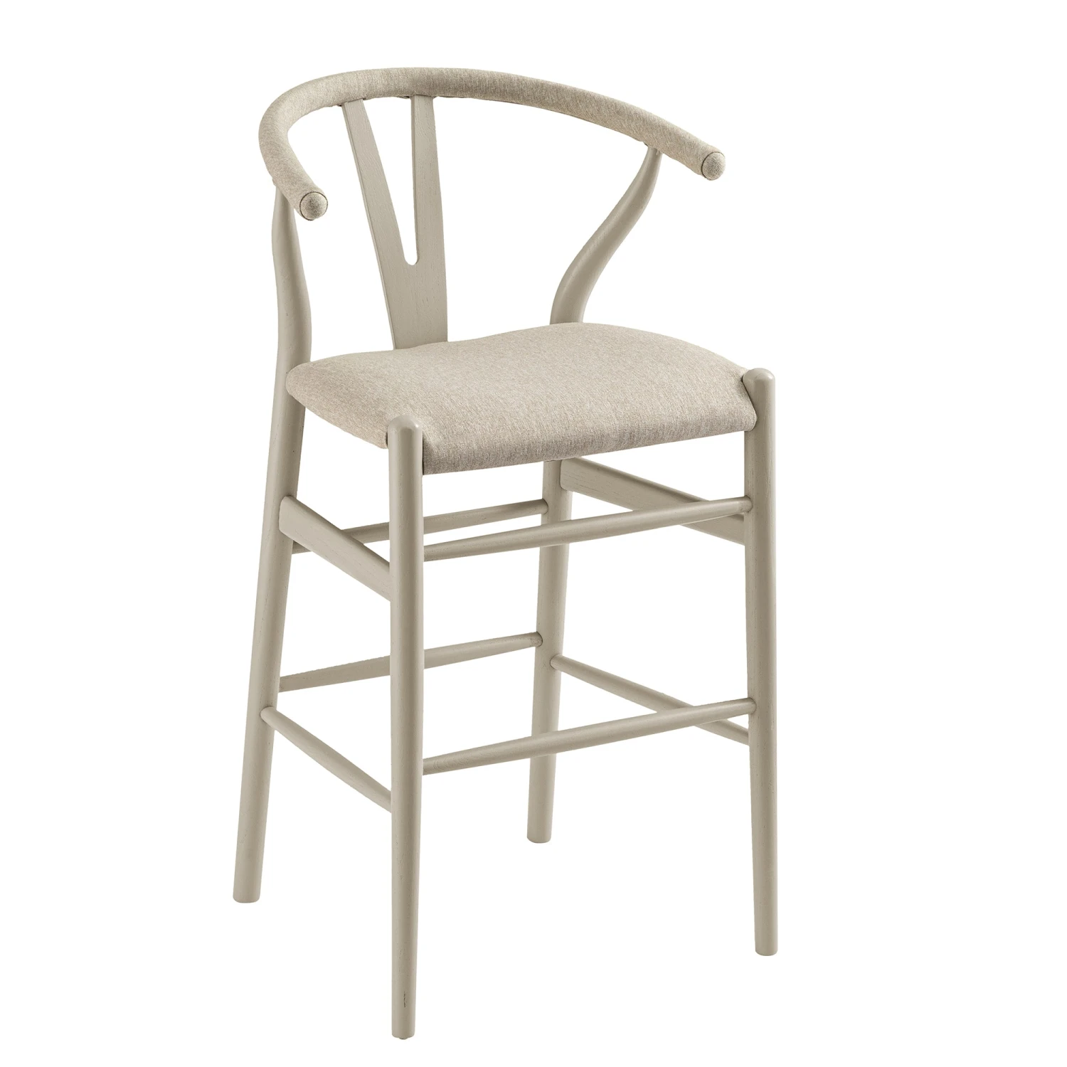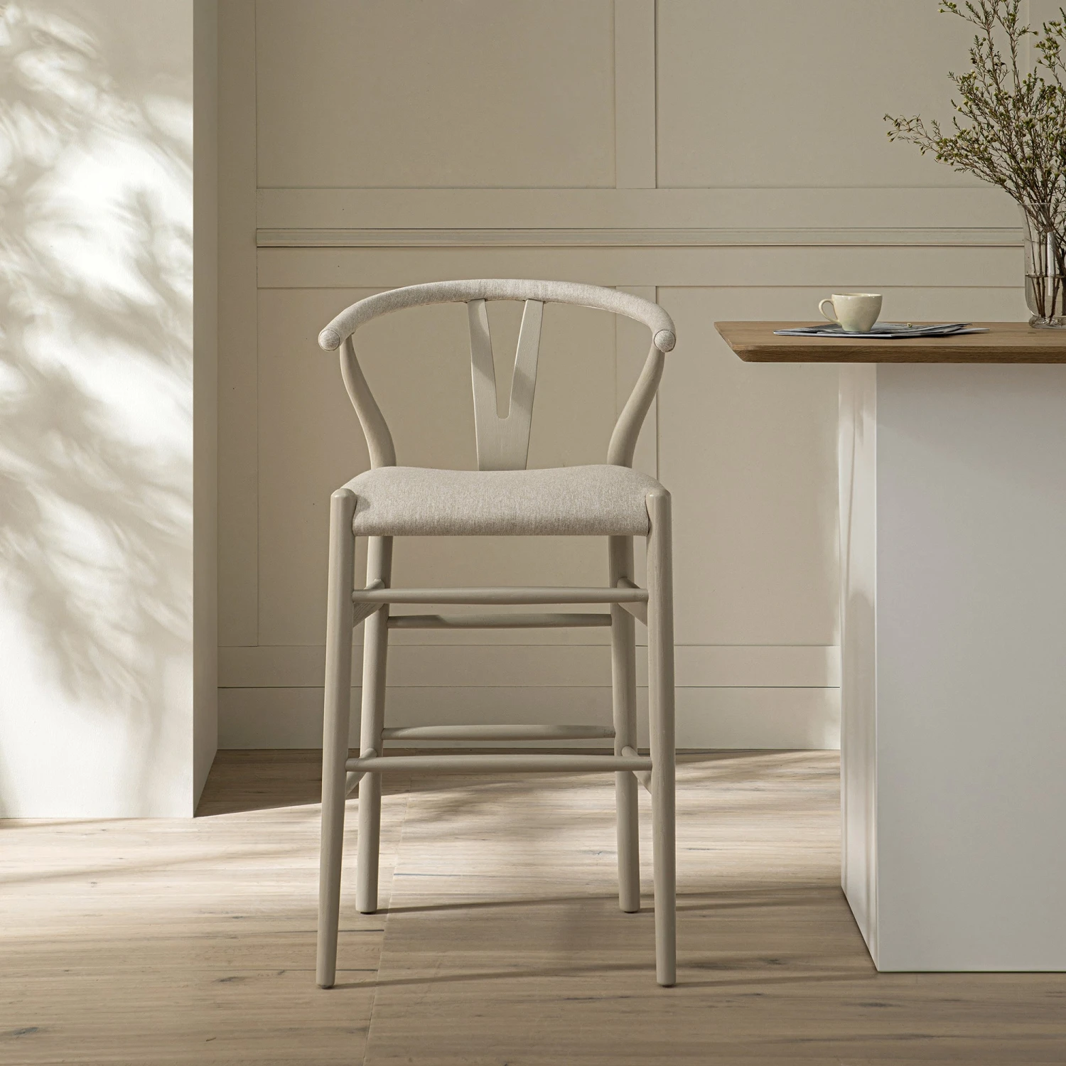- Featuring the Y-shaped back, the counter chair is sturdily crafted from solid elm with beautiful greige colour matte paint, coordinating the oatmeal fabric upholstered padded seat.