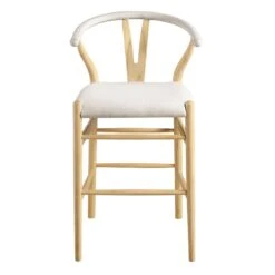 This stool stands out with its chic light beige woven fabric seat, perfectly complemented by a natural wood frame finished in a clear lacquer for enhanced durability. The iconic ‘Wishbone’ style Y-back silhouette offers a light, airy feel while ensuring structural integrity and comfort for long breakfasts or social evenings.