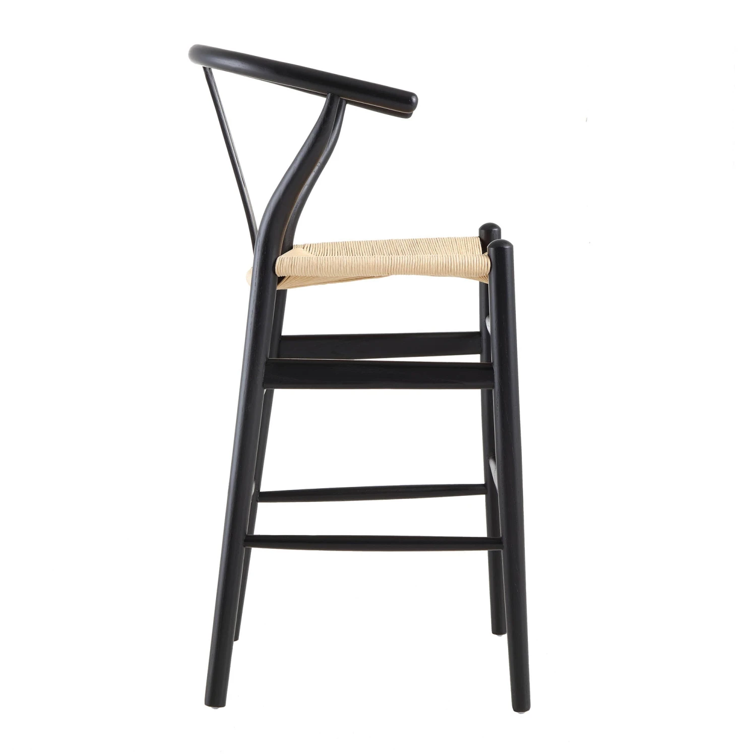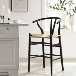 The Hansel Counter Stool is a masterpiece of craftsmanship, blending the structural integrity of solid elm wood with the organic texture of a hand-woven seat. Featuring a sleek black-finished frame and the iconic Y-shaped backrest, this stool provides a sophisticated silhouette that complements both modern and rustic interiors.
