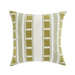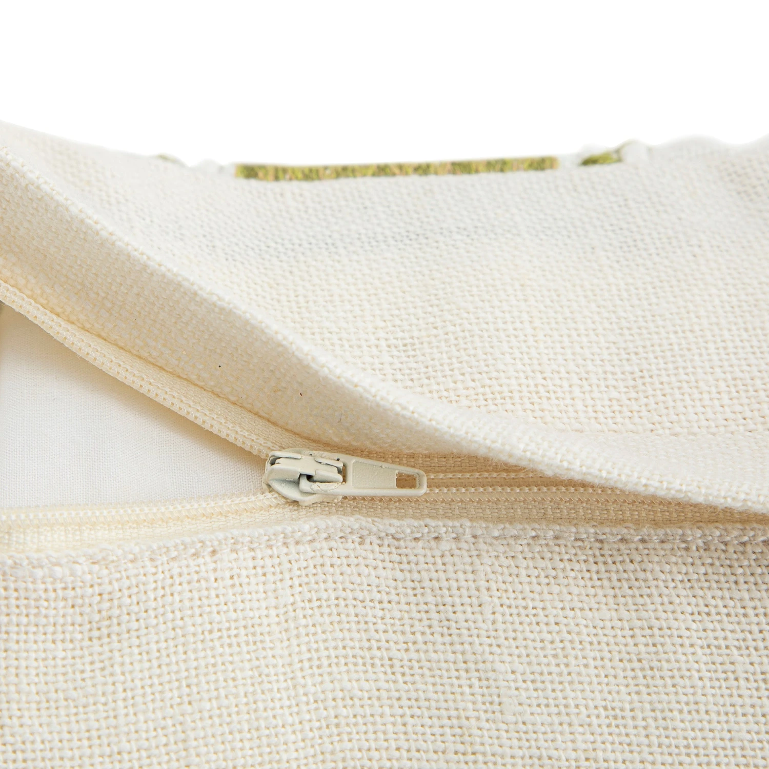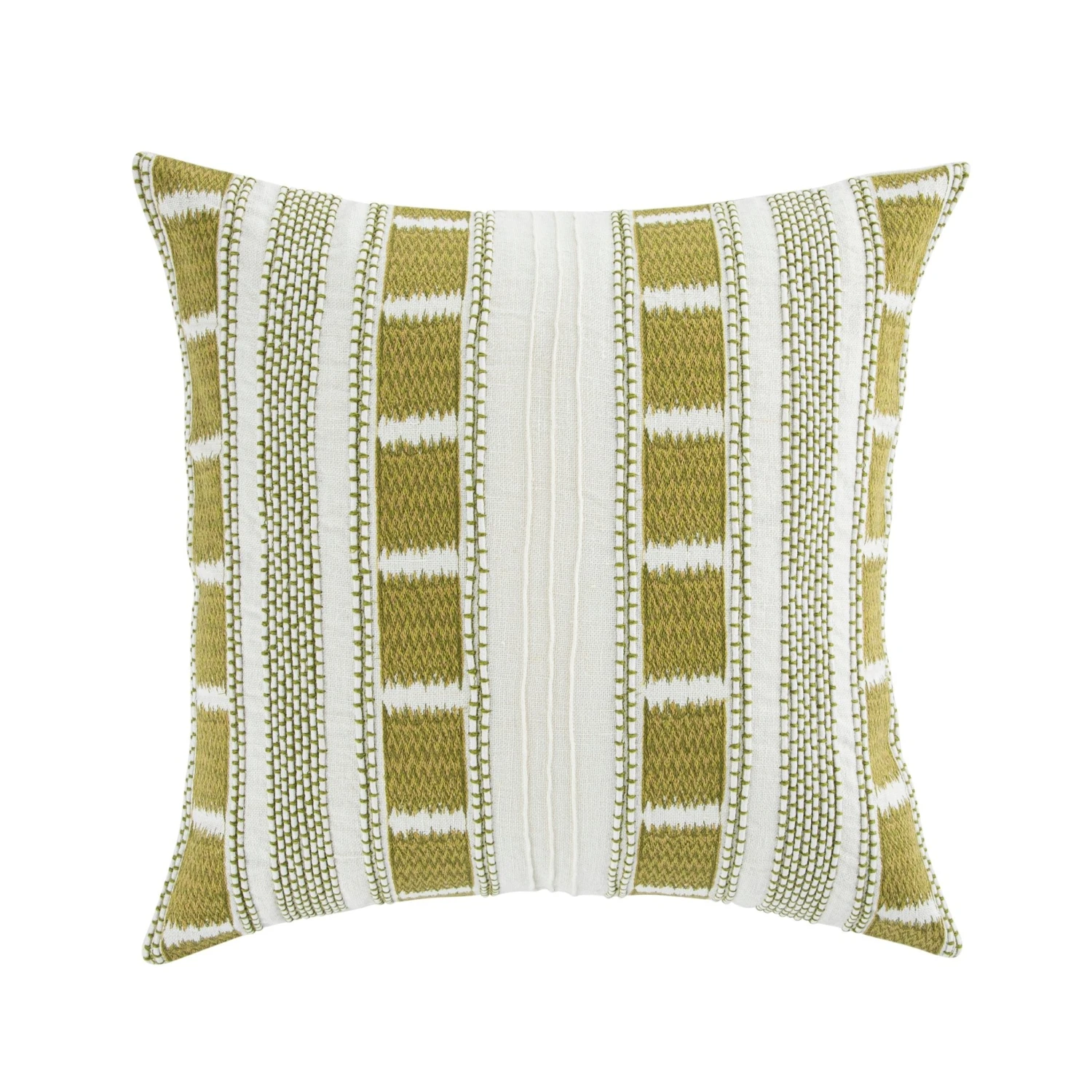 - Intricate Visual Details: The cushion features a crisp white linen base contrasted by a striking green linear pattern. This unique texture is achieved through specialized couching stitches and premium cotton embroidery, creating a tactile and visual masterpiece.