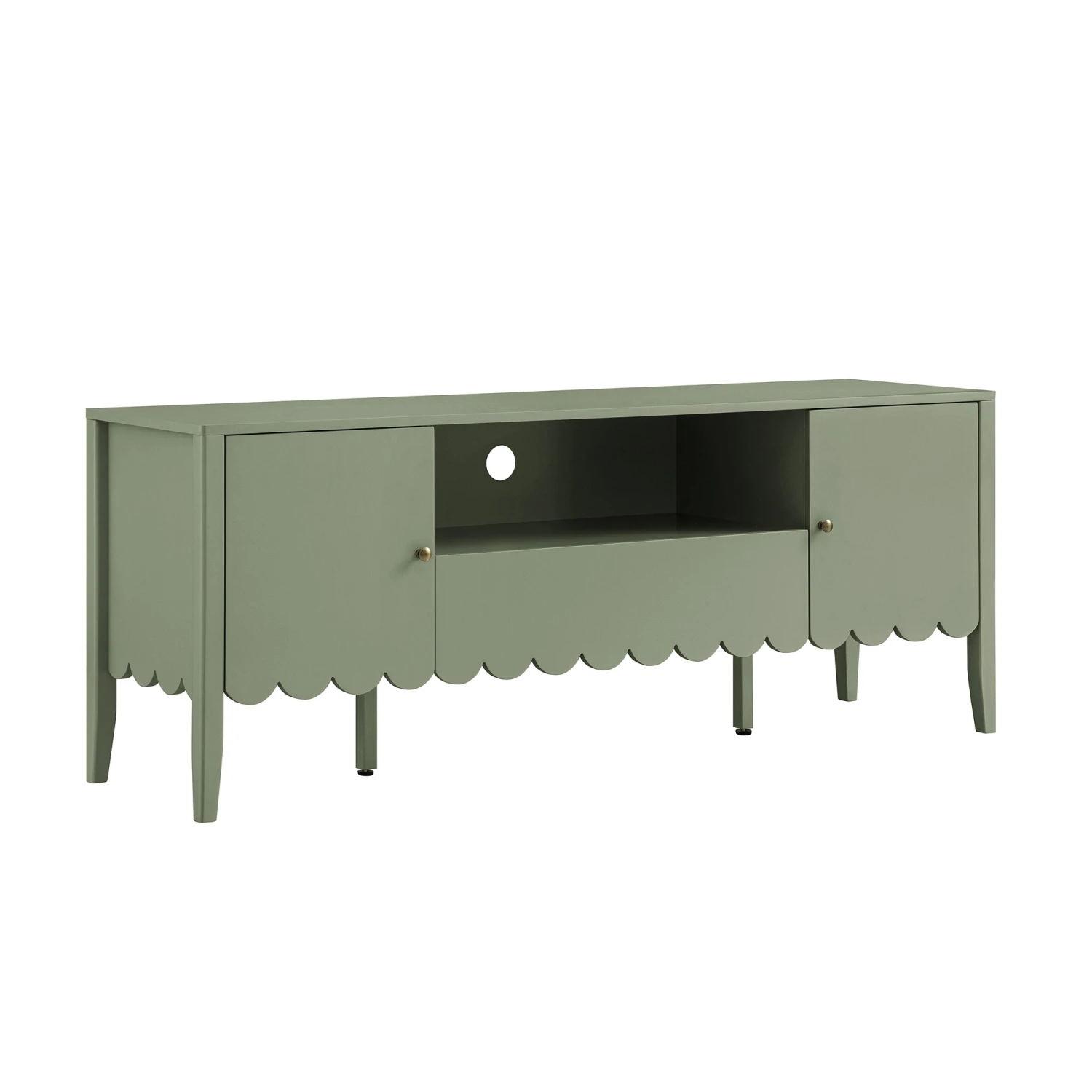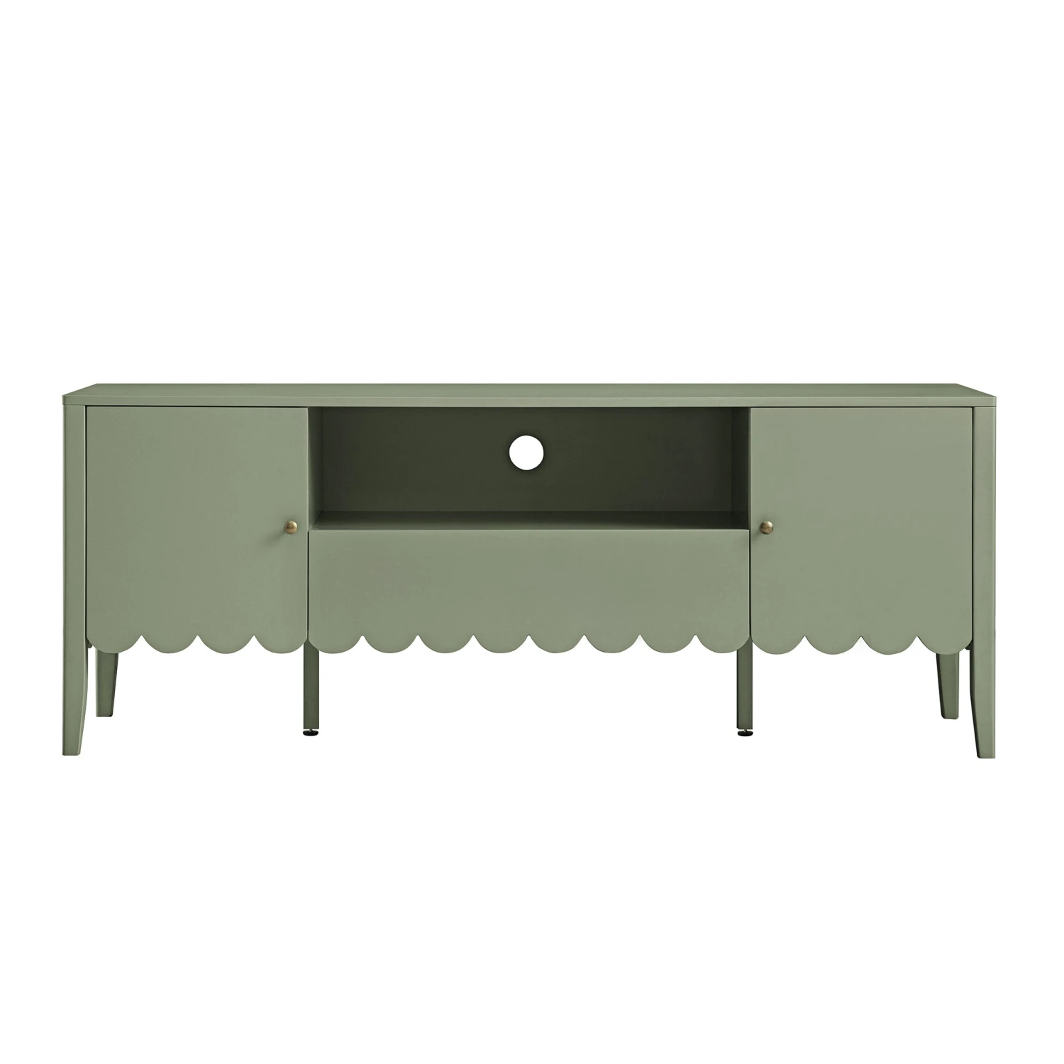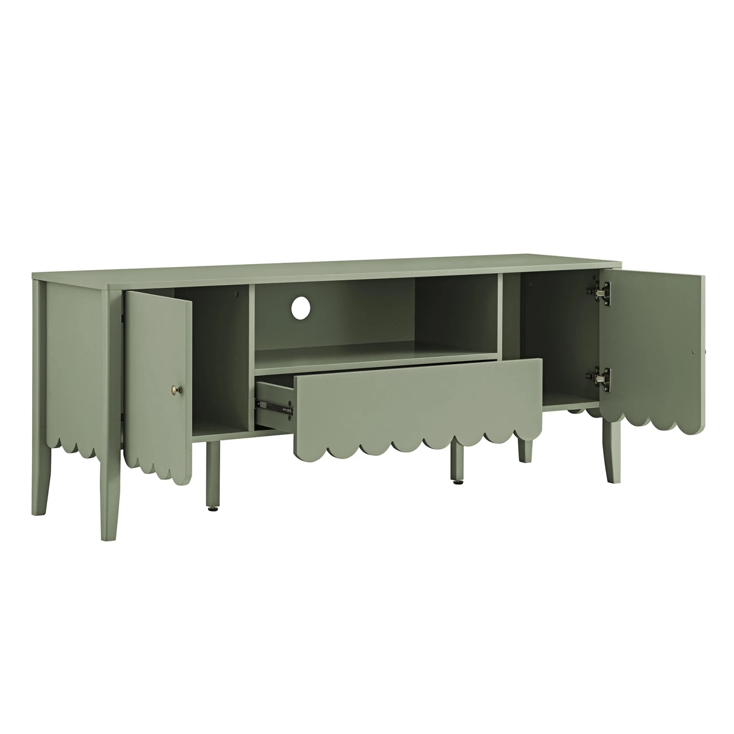 - Two doors open to storage, while an open shelf and drawer provides further space for display and storage.