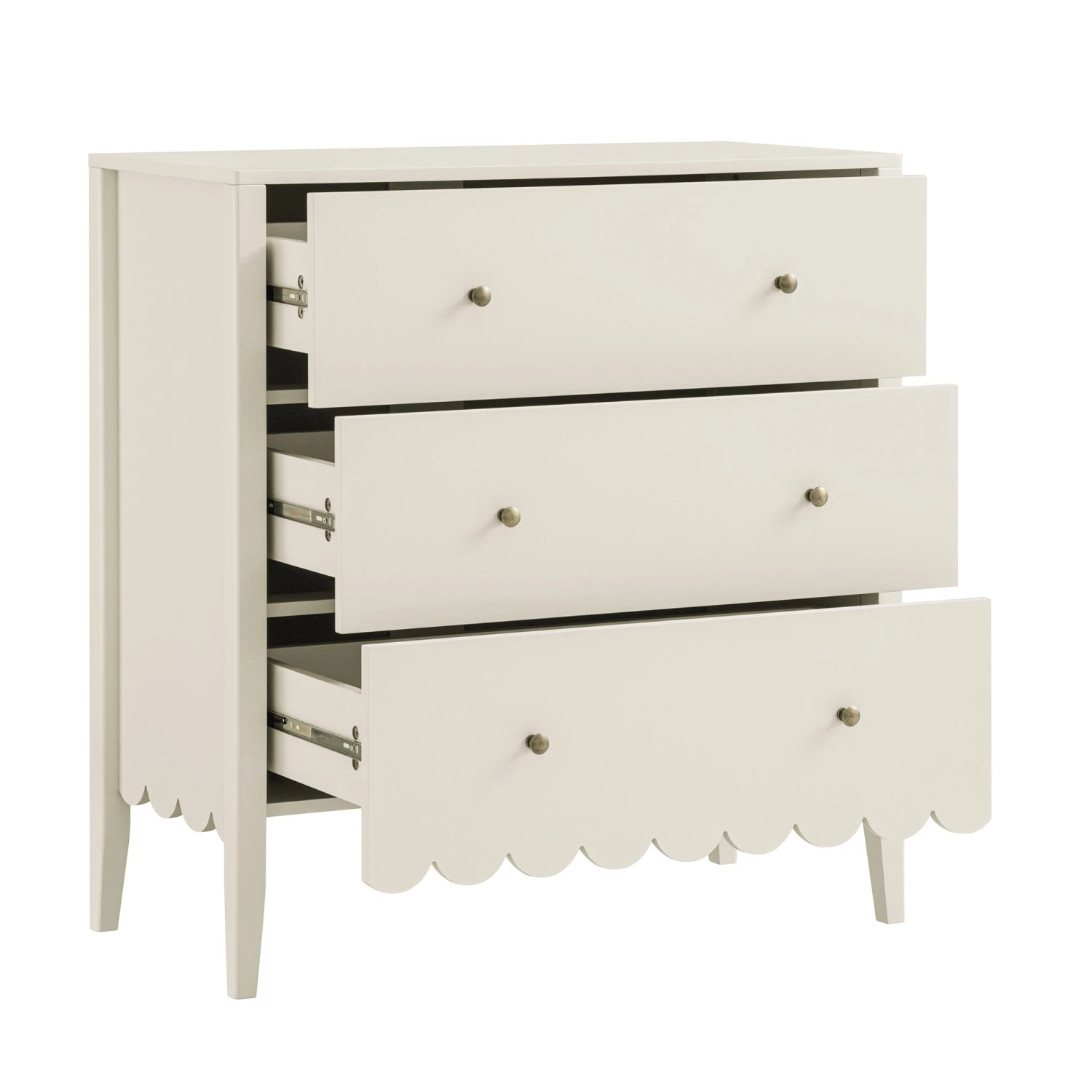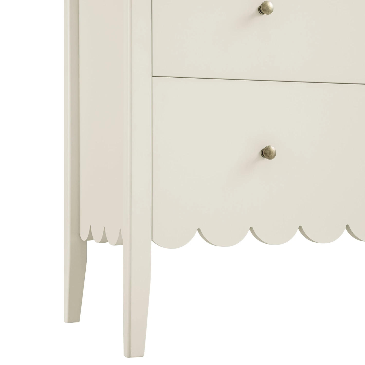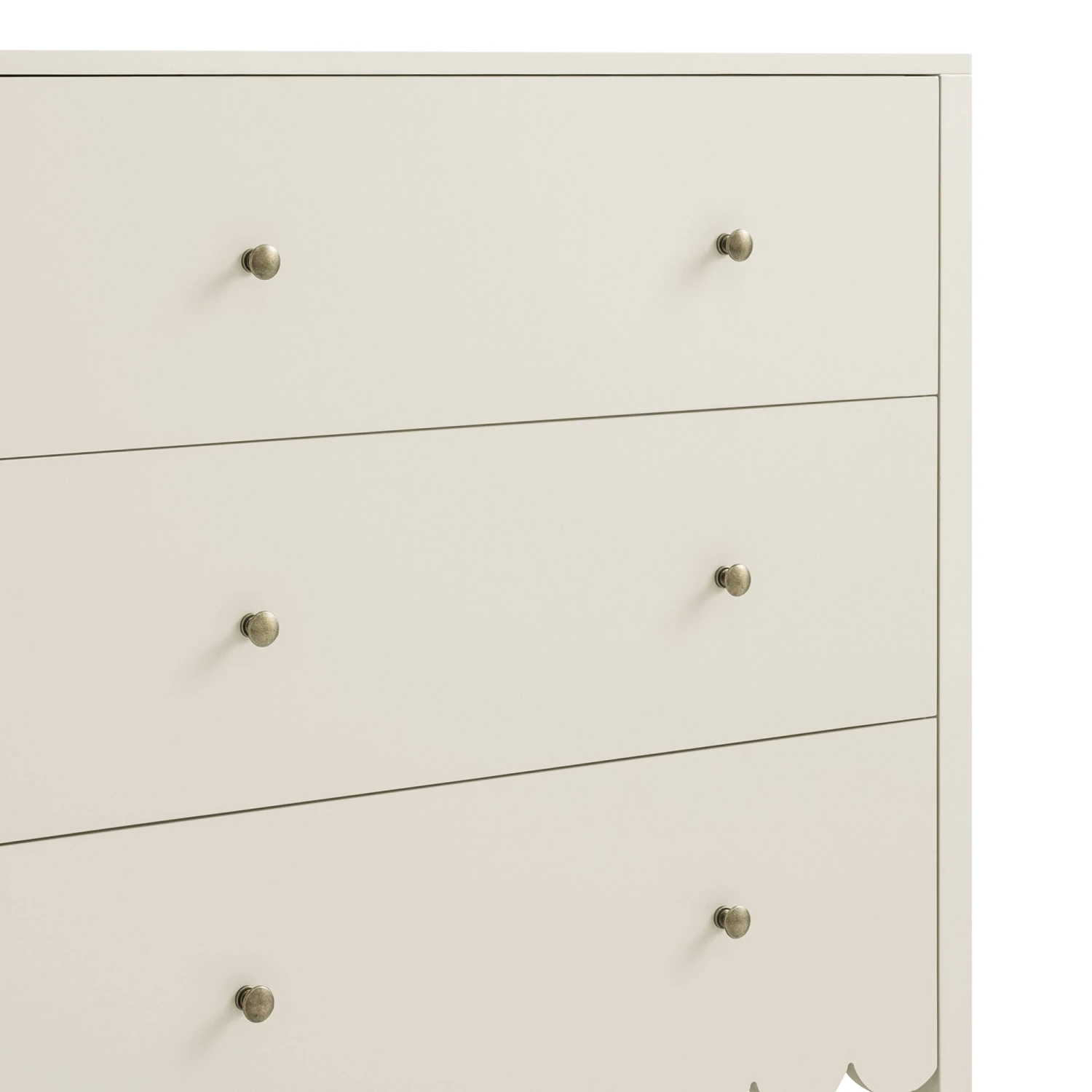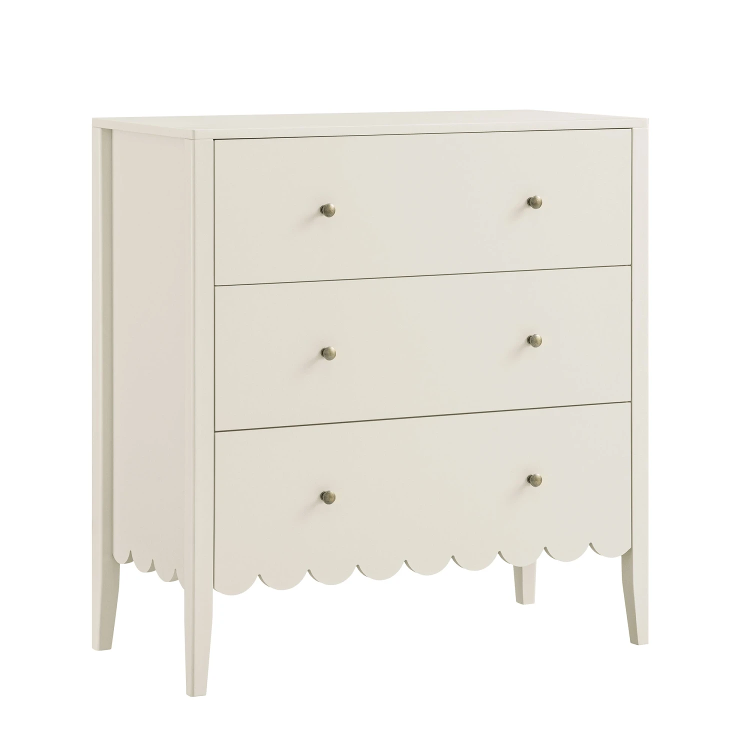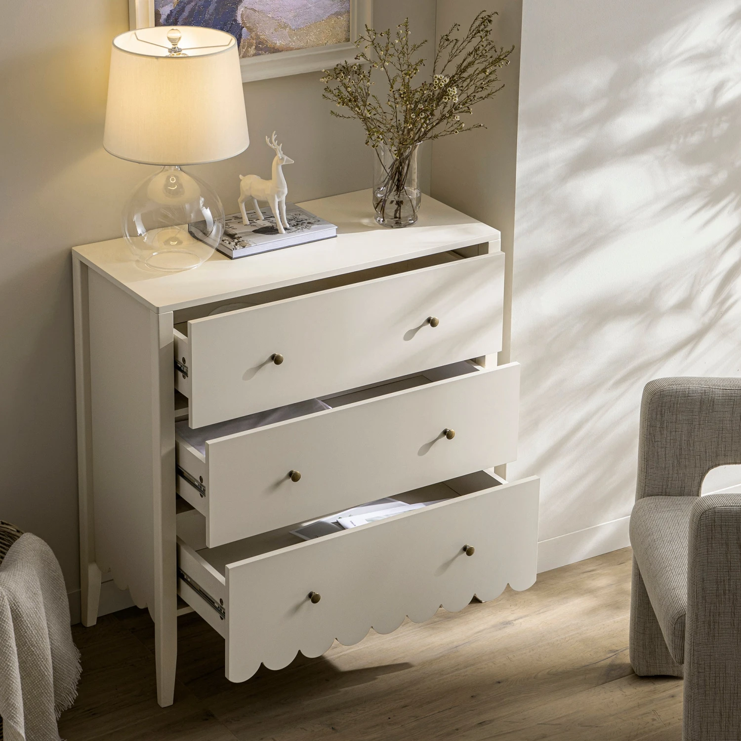 - Complete the look: Pictured with our Henley Scalloped Edge 3 Drawer Chest is our Greenwich Oatmeal and Beige Woven Textured Fabric Chair
