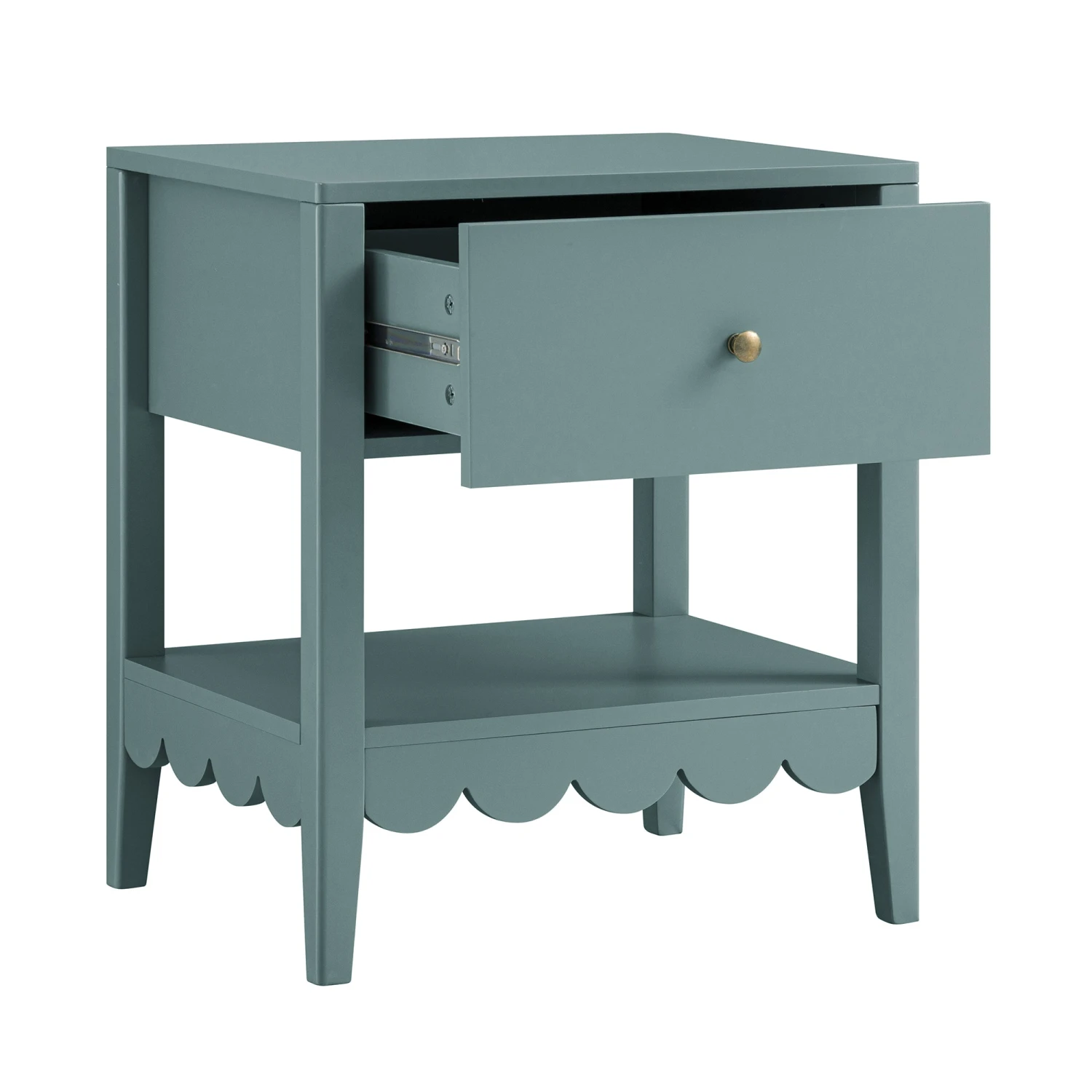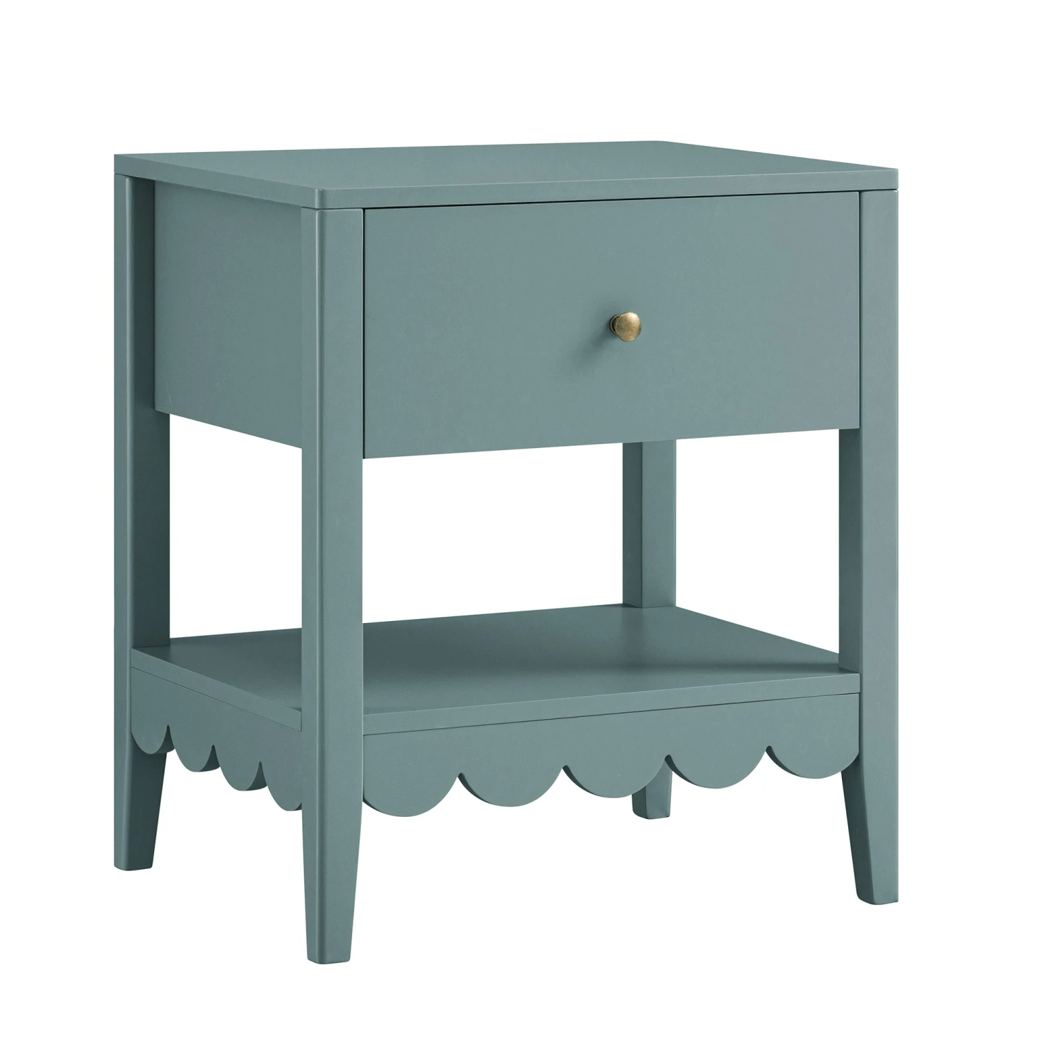 - Complete the look:ย Pictured with our Henley Scalloped Edge Bedside Table is our Egerie Curved Slate Blue Striped Fabric Ottoman Bed and our Aurora Hand Braided Cream Jute Rug