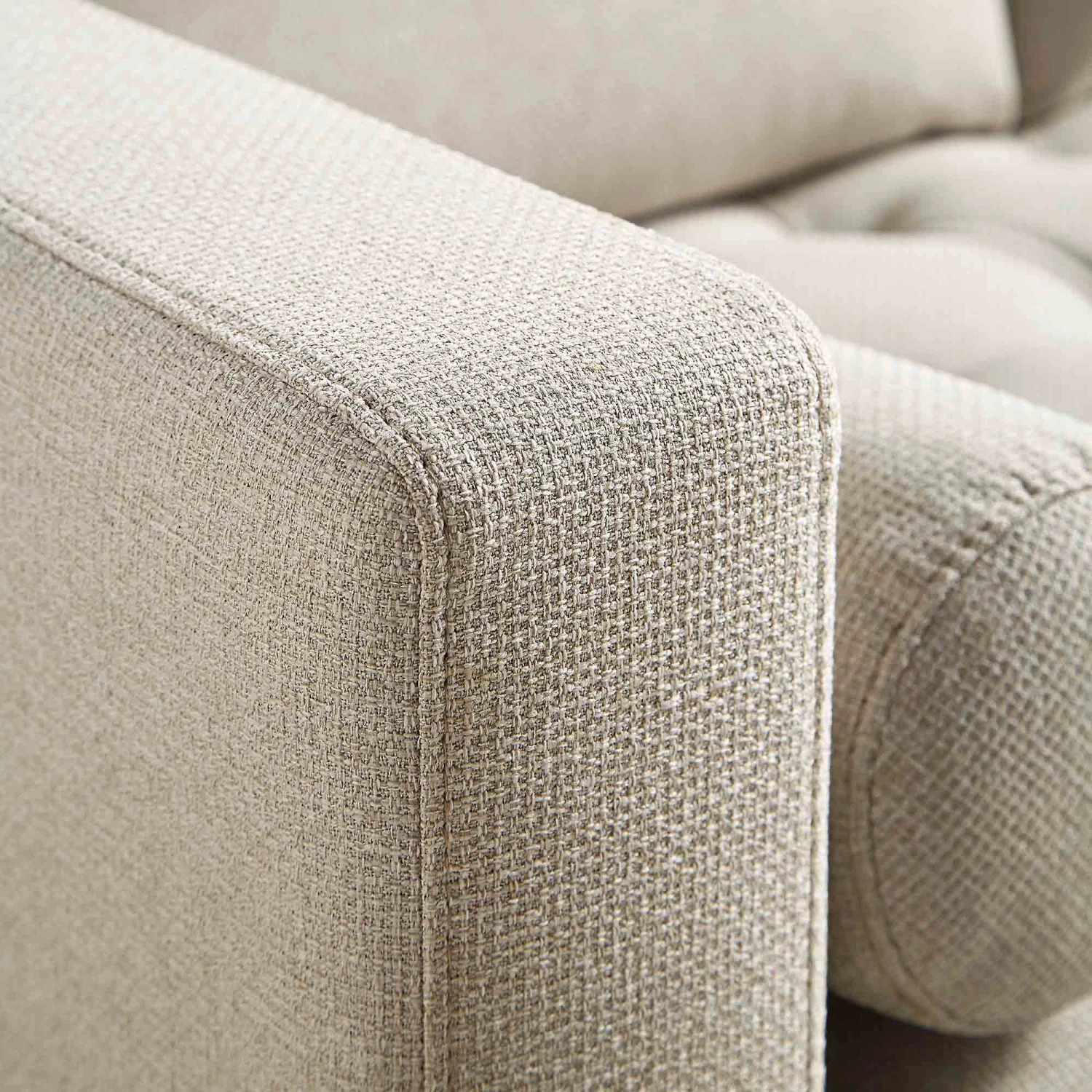 - Upholstered with beautiful beige woven fabric that’s easy to style with any decor, matched with solid wood legs with walnut colour stained finish.