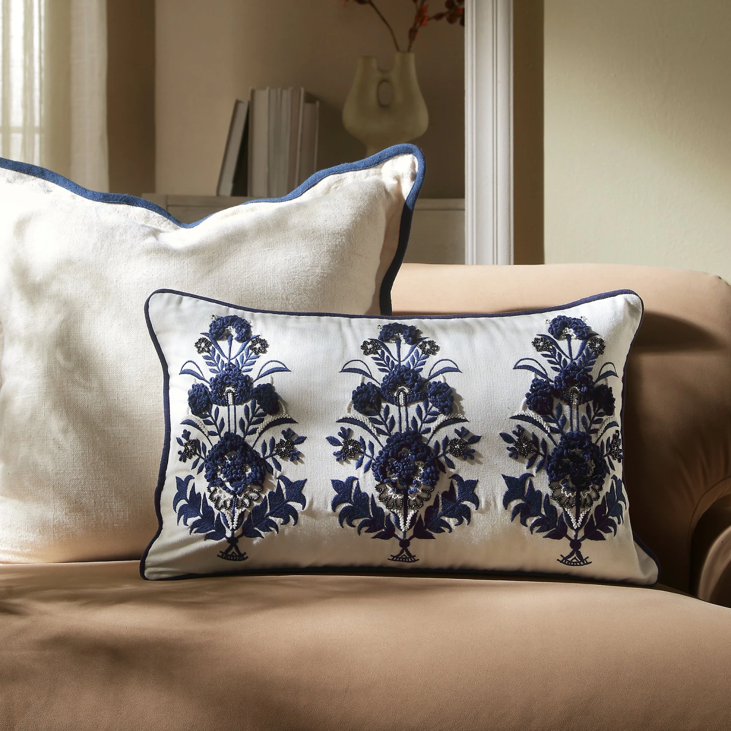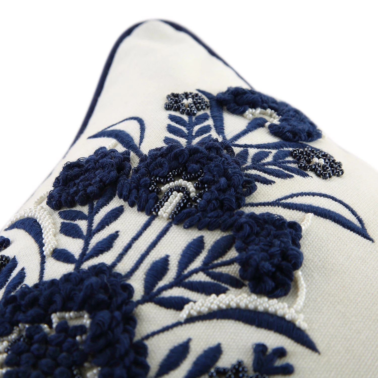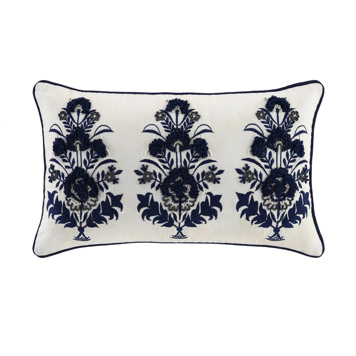 Our Saphira floral cushion is a true embodiment of beauty and craftsmanship, designed to bring a sophisticated artisanal touch to any room. Handmade in India, this rectangular piece features a crisp white cotton slub base that serves as a canvas for intricate indigo blue embroidery. The visual depth is created through a stunning combination of raised loops, delicate beadwork, and classic floral motifs, all expertly framed by deep blue contrast piping.