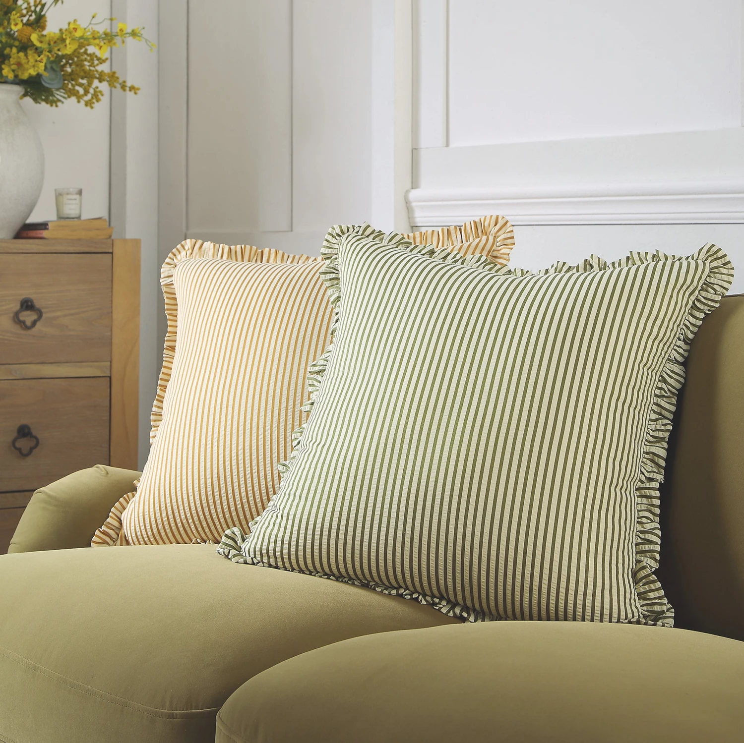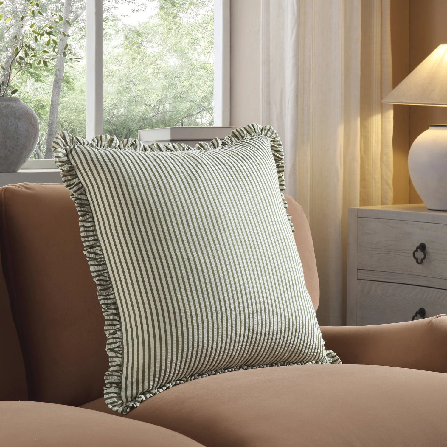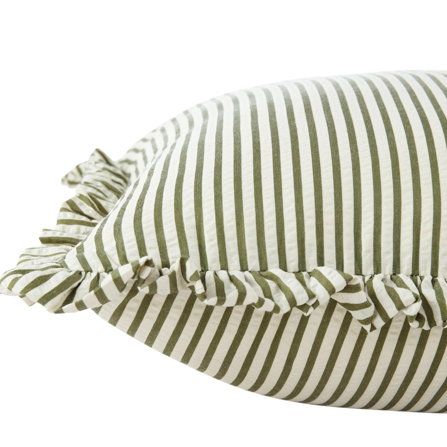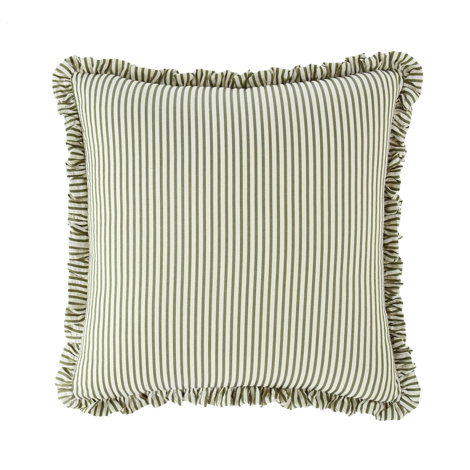 Inject effortless style into your home with the Iris Ticking Green Stripe Seersucker Frill Cushion. This piece combines the timeless appeal of ticking stripes with a soft, textured seersucker finish, making it a versatile addition to any sofa, armchair, or bed.