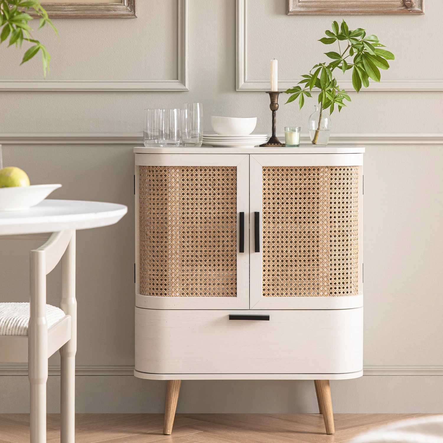 - Complete the look: Pictured with the Izzy White Curved Rattan Small Sideboard is our Minley Light Taupe High Gloss 2-in-1 Carver Chair.