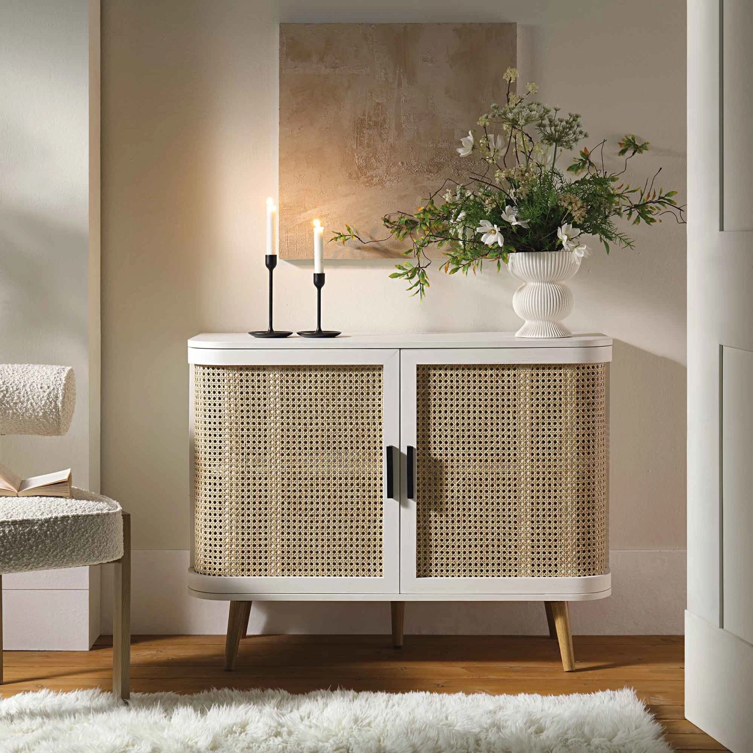 - Complete the look:ย Pictured with our Izzy Curved Rattan 2-Doorn Small Sideboard is our Ophelia Taupe Boucle Chair