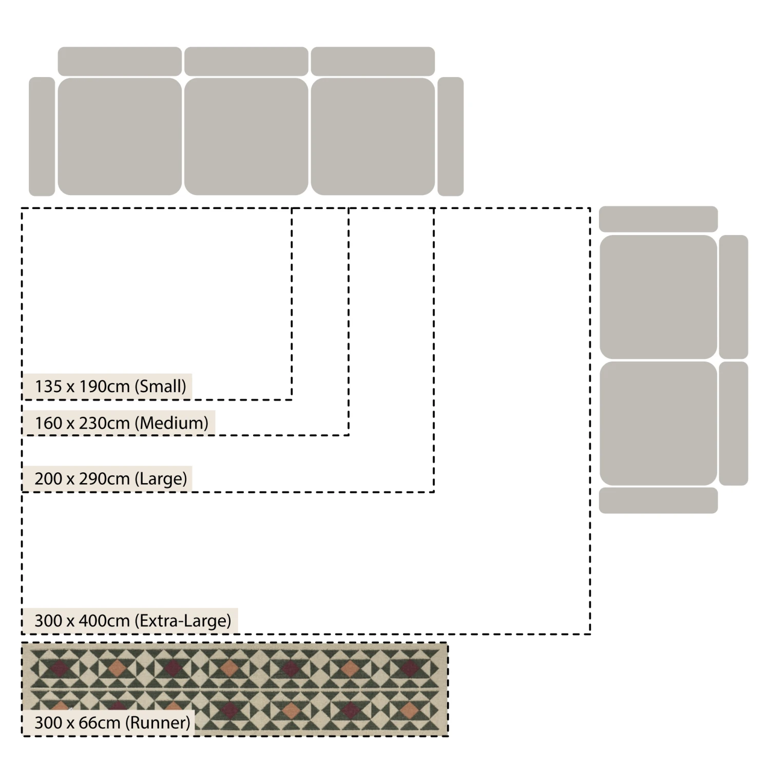 This striking runner features a sophisticated repeat geometric pattern in shades of earthy olive green, warm ochre, and deep maroon red. These bold hues are perfectly balanced by a neutral cream background, providing a standout look that complements both minimalistic and bohemian interiors. Its flat-woven, no-pile construction offers a sleek, slimline aesthetic.