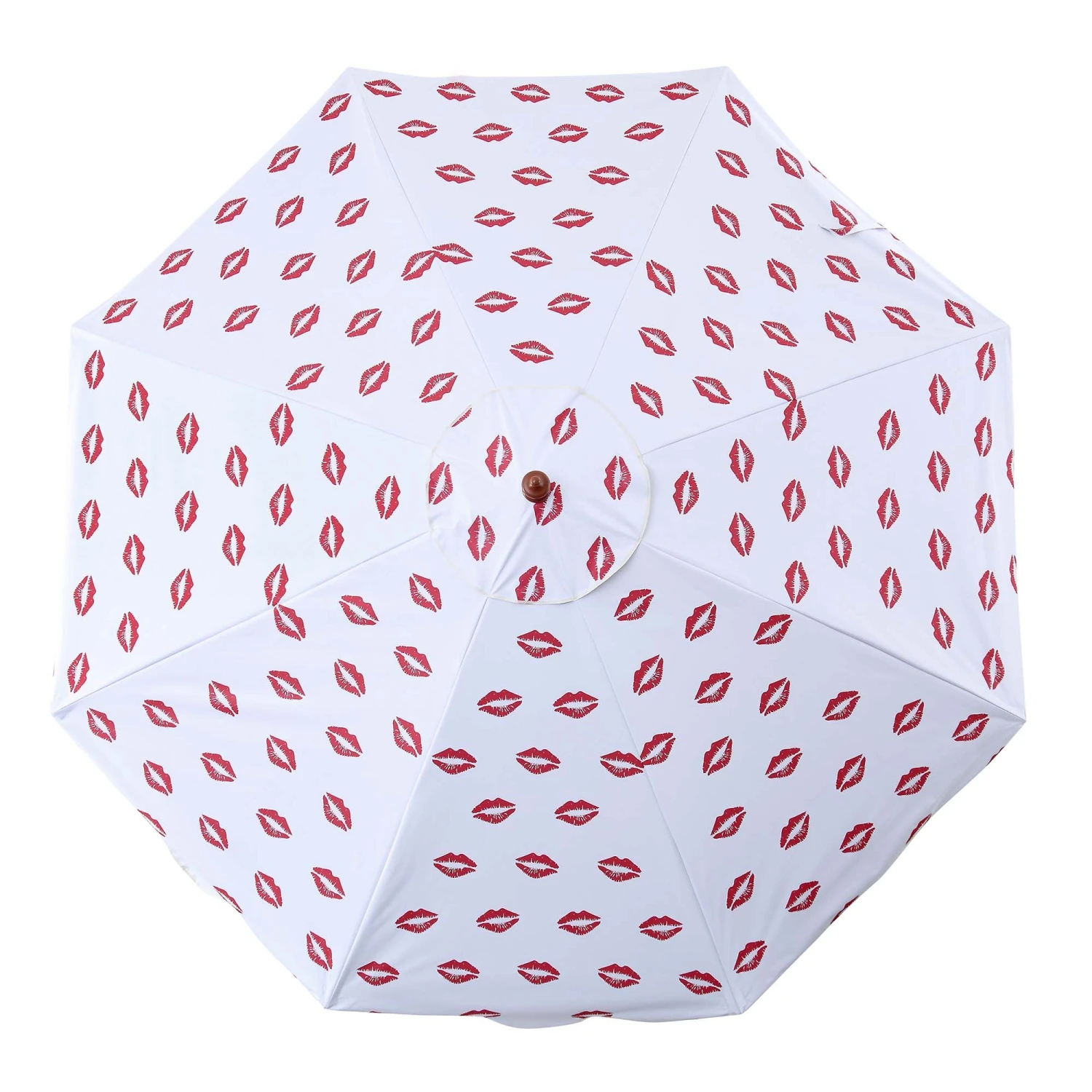 - This beautiful garden parasol is designed with double layers of fabrics – red lip kisses patternย as exterior and beige as interior. Chic scalloped edge details complement the look.
