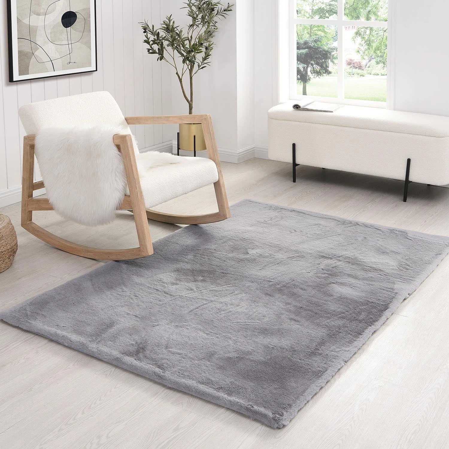 - Complete the look: Pictured with our Lush Supersoft Grey Faux Fur Rug is our popular Fyne Ecru Boucle Rocking Armchair