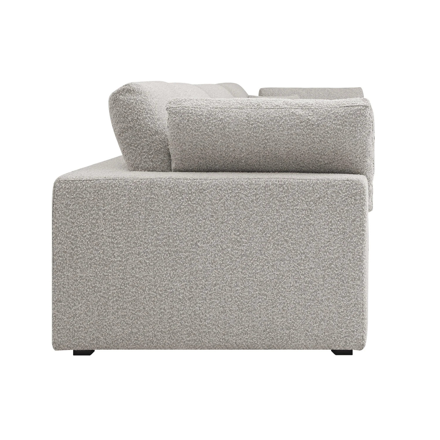 - Upholstered with textured taupe boucle fabric for a contemporary look.