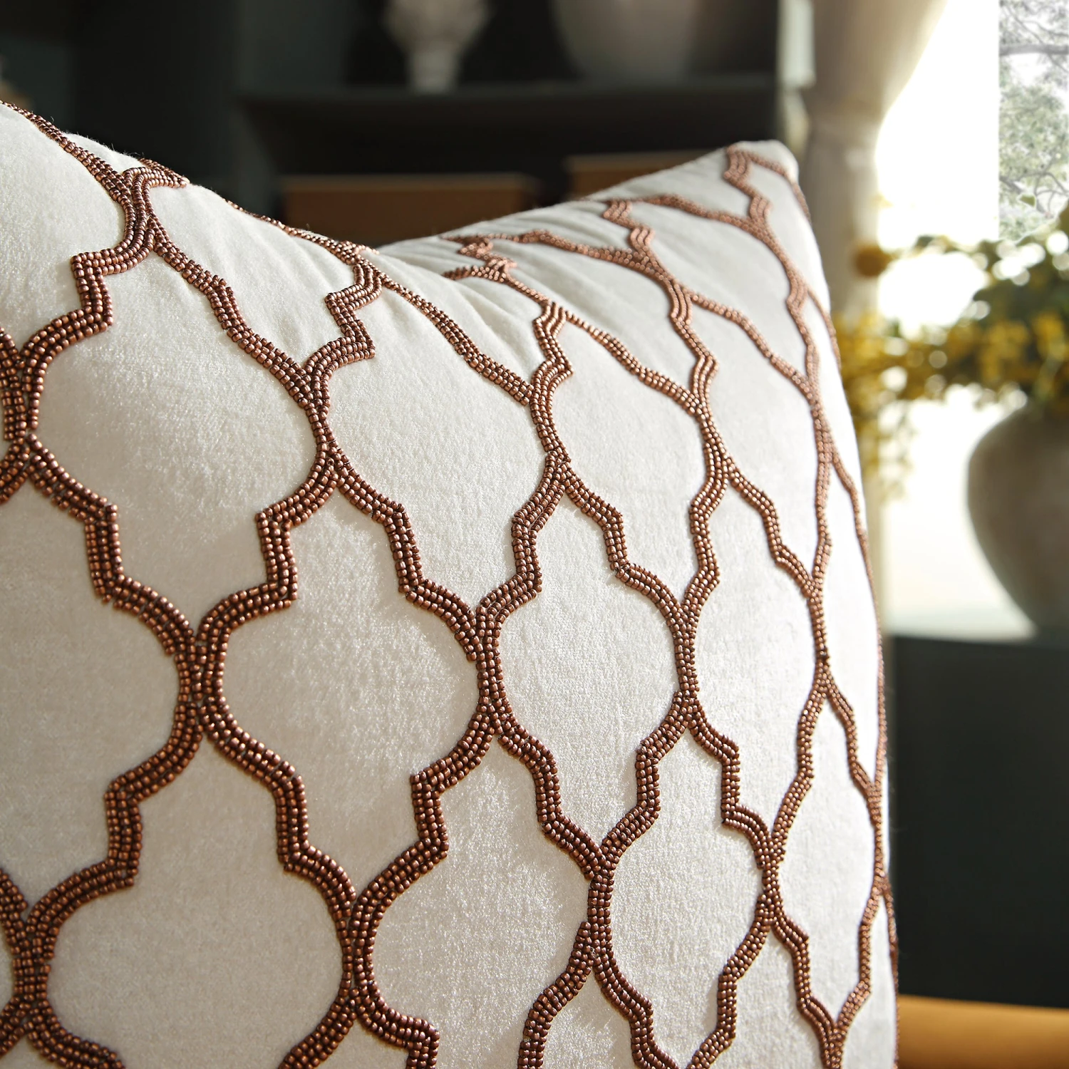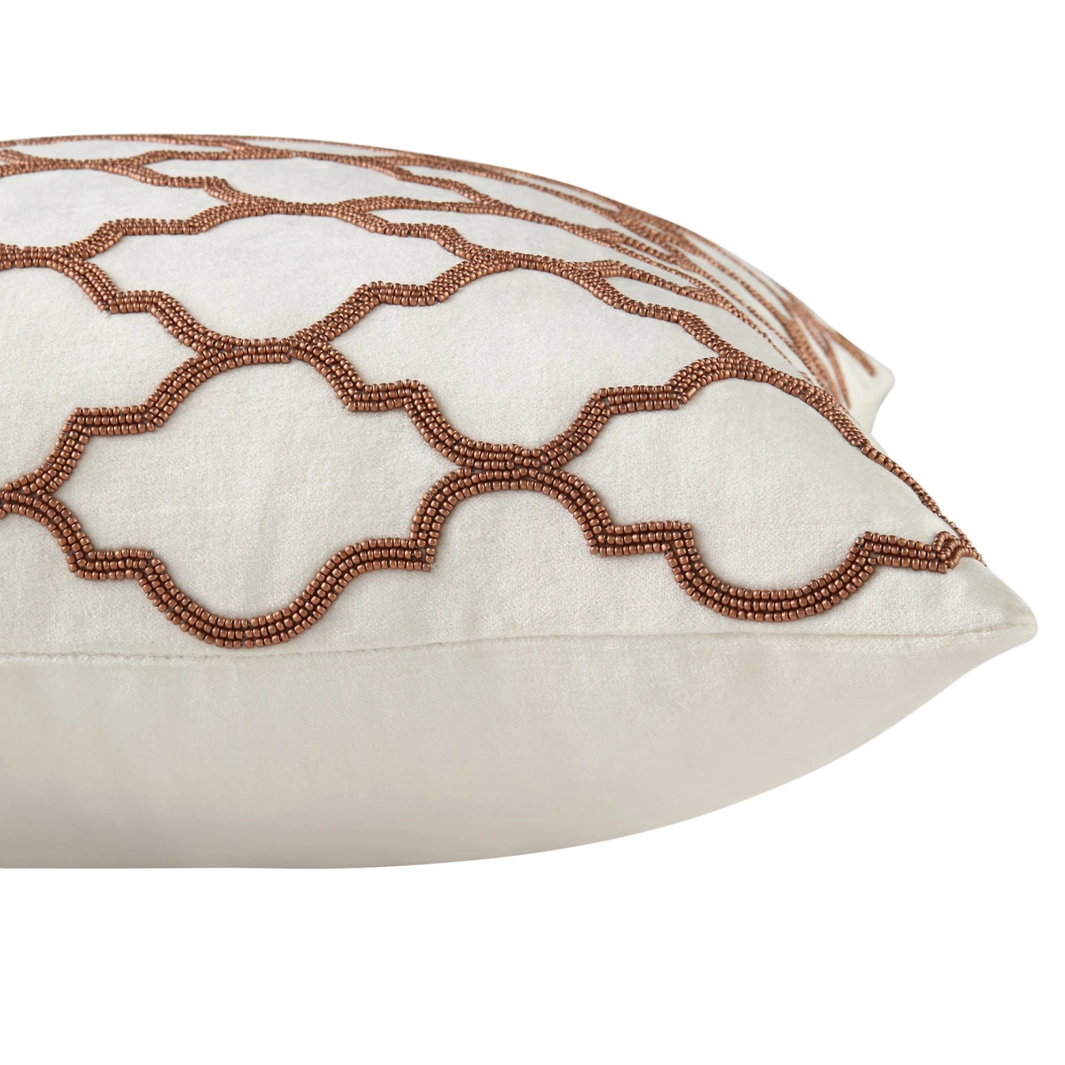 This cushion is crafted from sumptuous pearl white cotton velvet, providing a soft and luxurious texture. It is intricately adorned with bronze beads arranged in a classic trellis pattern, creating a shimmering contrast that catches the light and adds depth to your dΓ©cor.