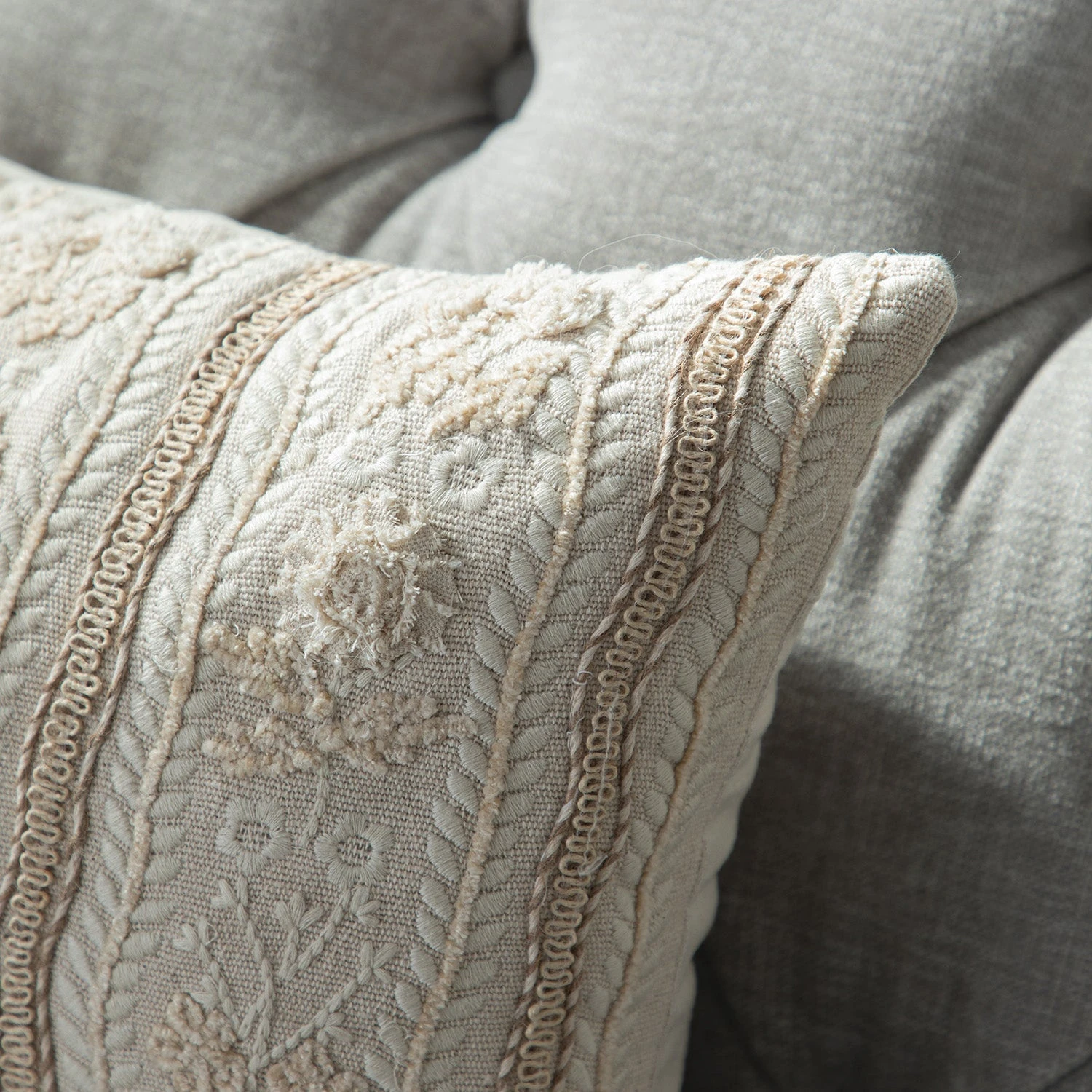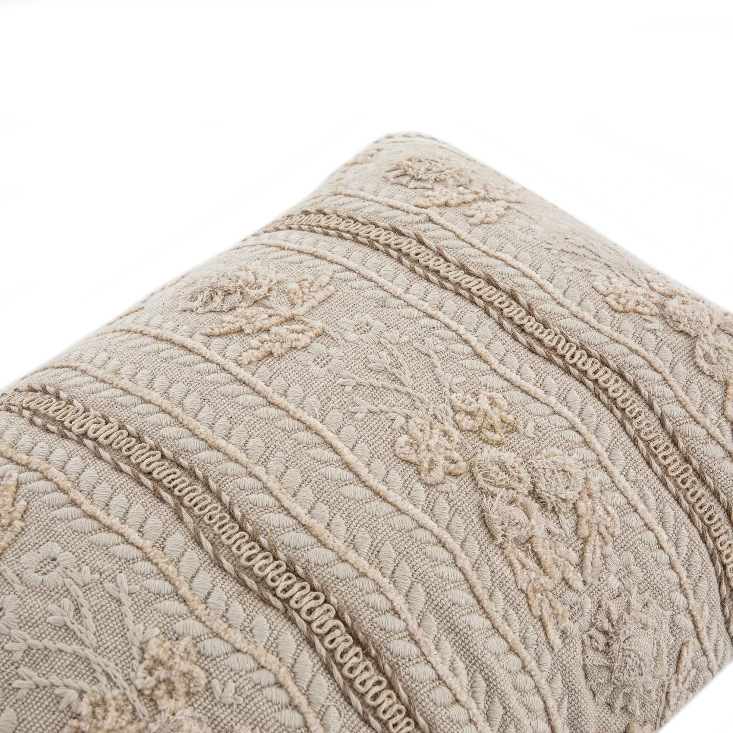 The Sophia cushion is a masterclass in texture. It features a thick, cream ribbed cotton base with a rustic, uneven finish that provides a beautiful tactile contrast to the delicate embroidery. The face of the cushion showcases a stunning repeat pattern of flowers and foliage, meticulously crafted using natural Jute lace and fine cotton thread stitches to create a multi-dimensional effect.