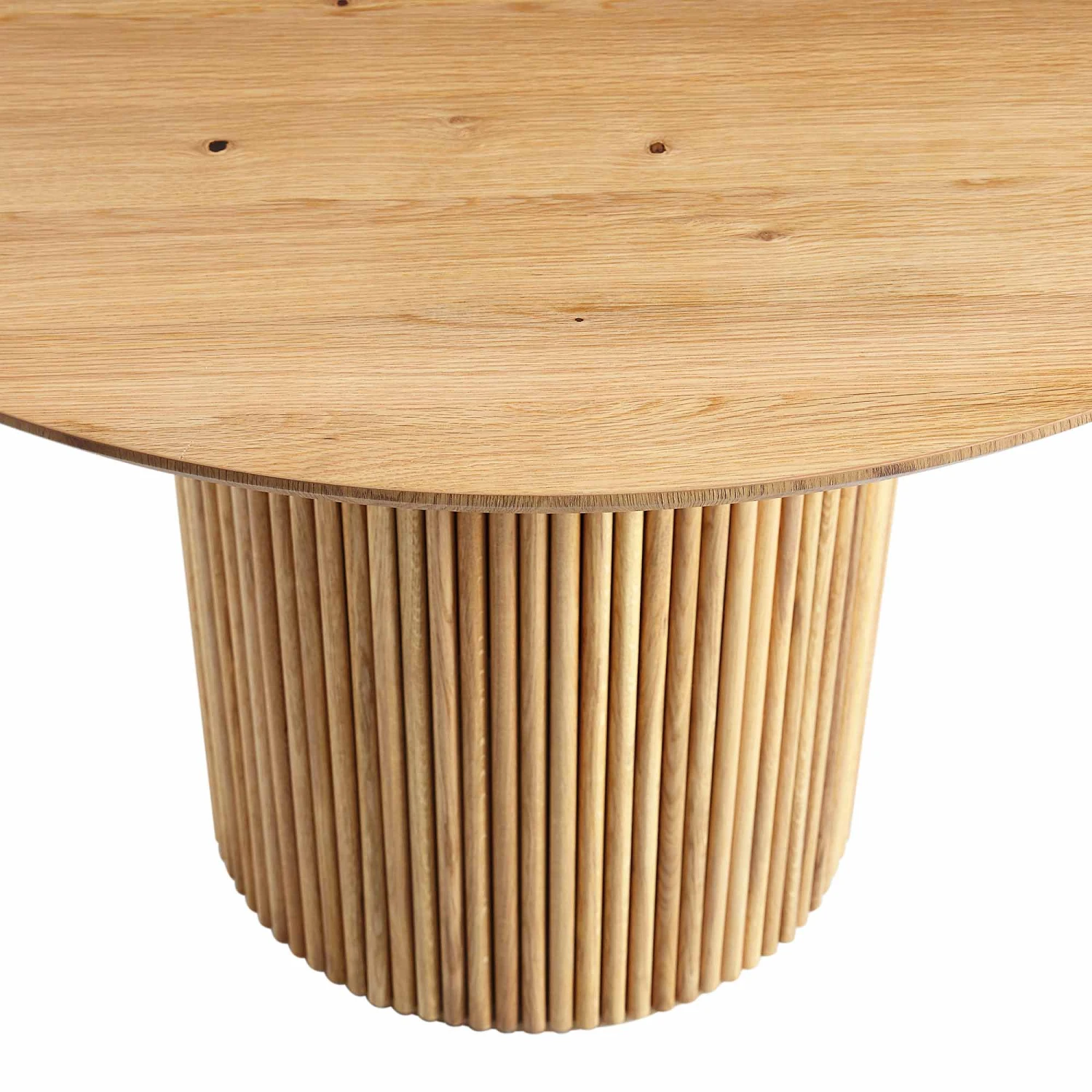 Elevate your dining experience with the Maru Round Oak Pedestal Dining Table, a masterpiece of contemporary Japandi aesthetics. The standout feature is its meticulously crafted fluted base, constructed from solid oak, which provides a striking architectural silhouette and exceptional stability.