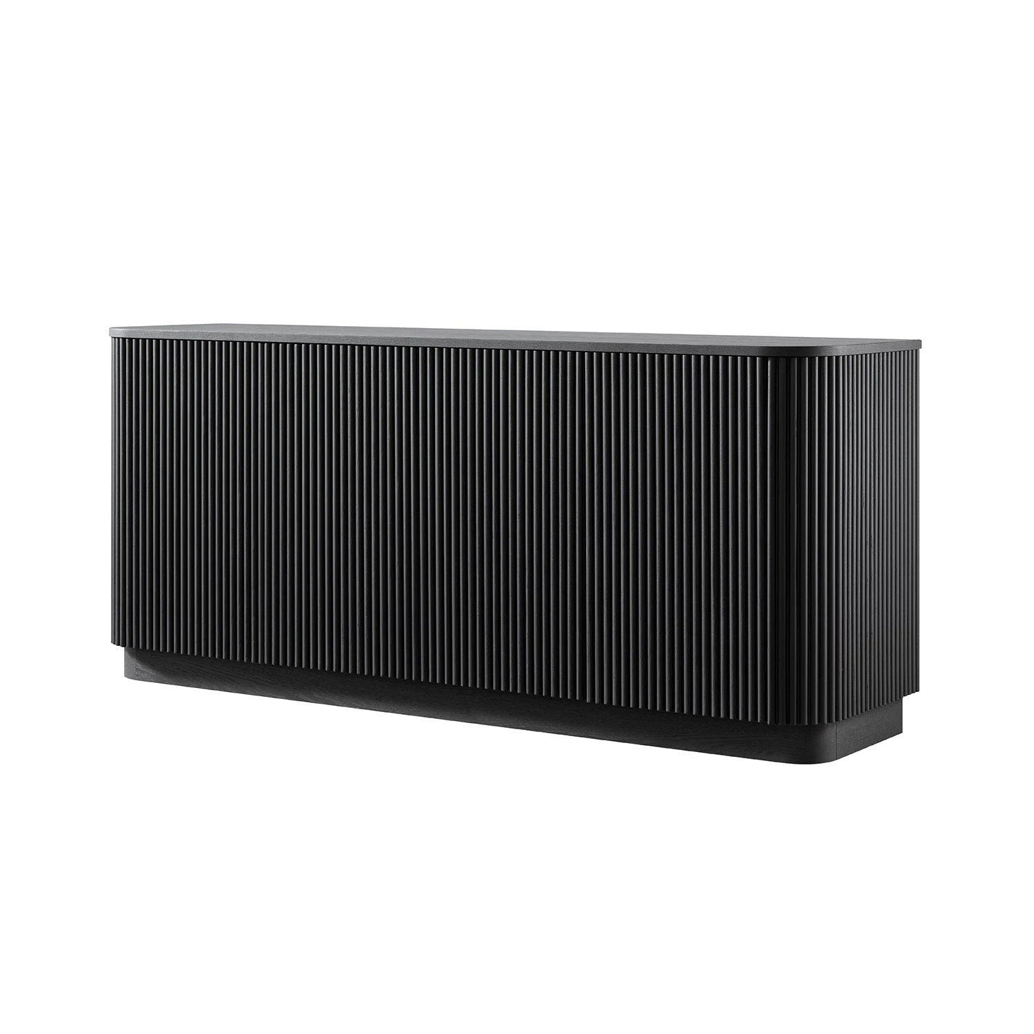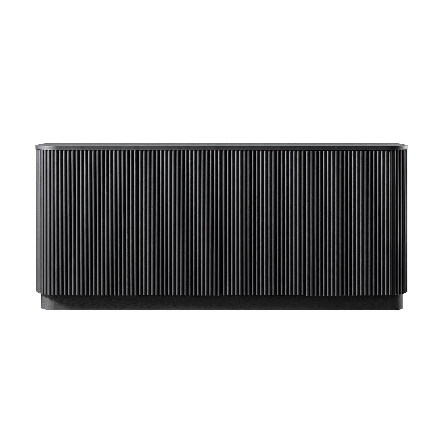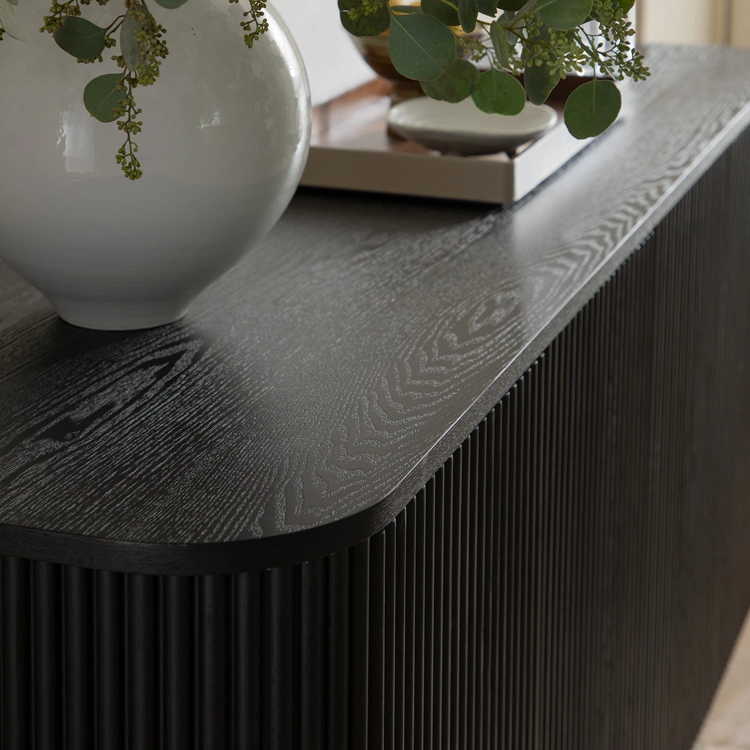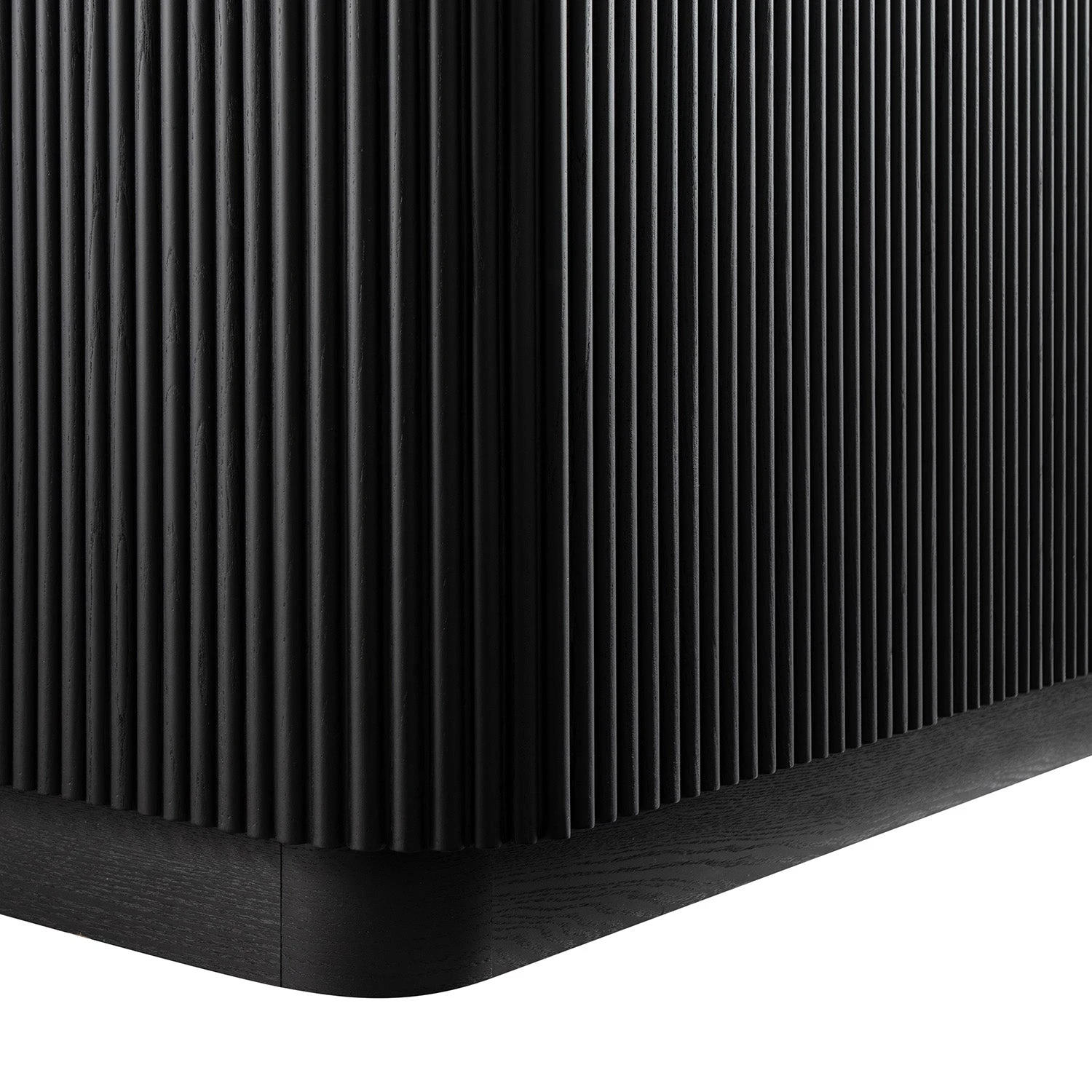 - The ebonyย finish enhances the fluted detail across its curved edges and door fronts, while the natural wood grain of solid ash and ash veneer adds texture and depth beneath the darkness.