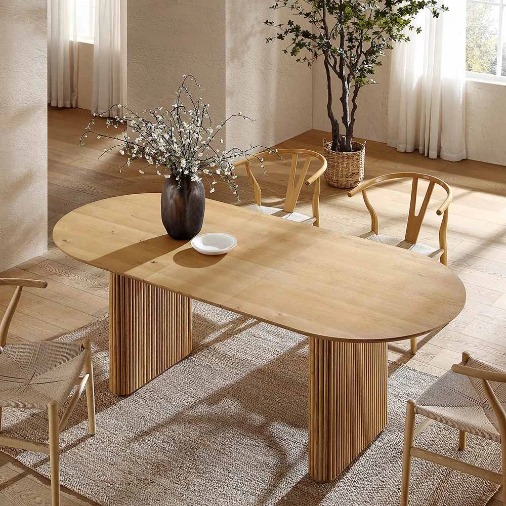 Crafted from a combination of solid oak and high-quality oak veneer, each table showcases a unique tapestry of natural grains and knots, protected by a refined clear wax finish. The soft oval silhouette provides a gentle flow to your dining space, while the fluted pedestals add depth and a tactile, artisanal quality that defines the Japandi aesthetic.