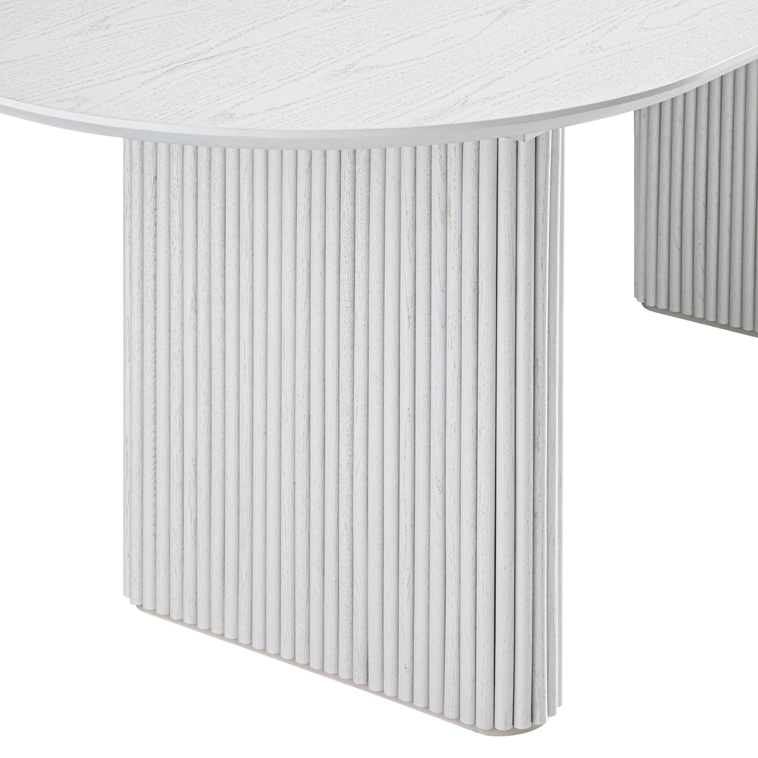 This table features a sophisticated double pedestal base with intricate fluted detailing that adds texture and architectural depth. The oval tabletop, crafted from solid oak and oak veneer, showcases a distressed washed white paint finish that allows the unique natural wood grains and knots to emerge, ensuring your furniture is one-of-a-kind.