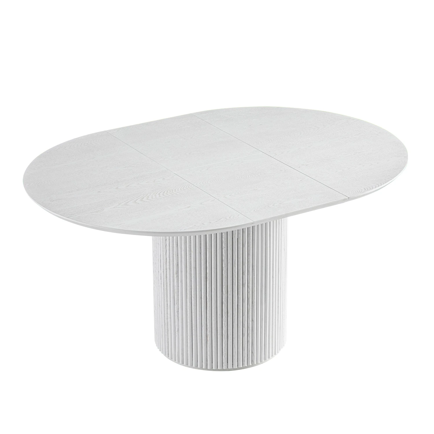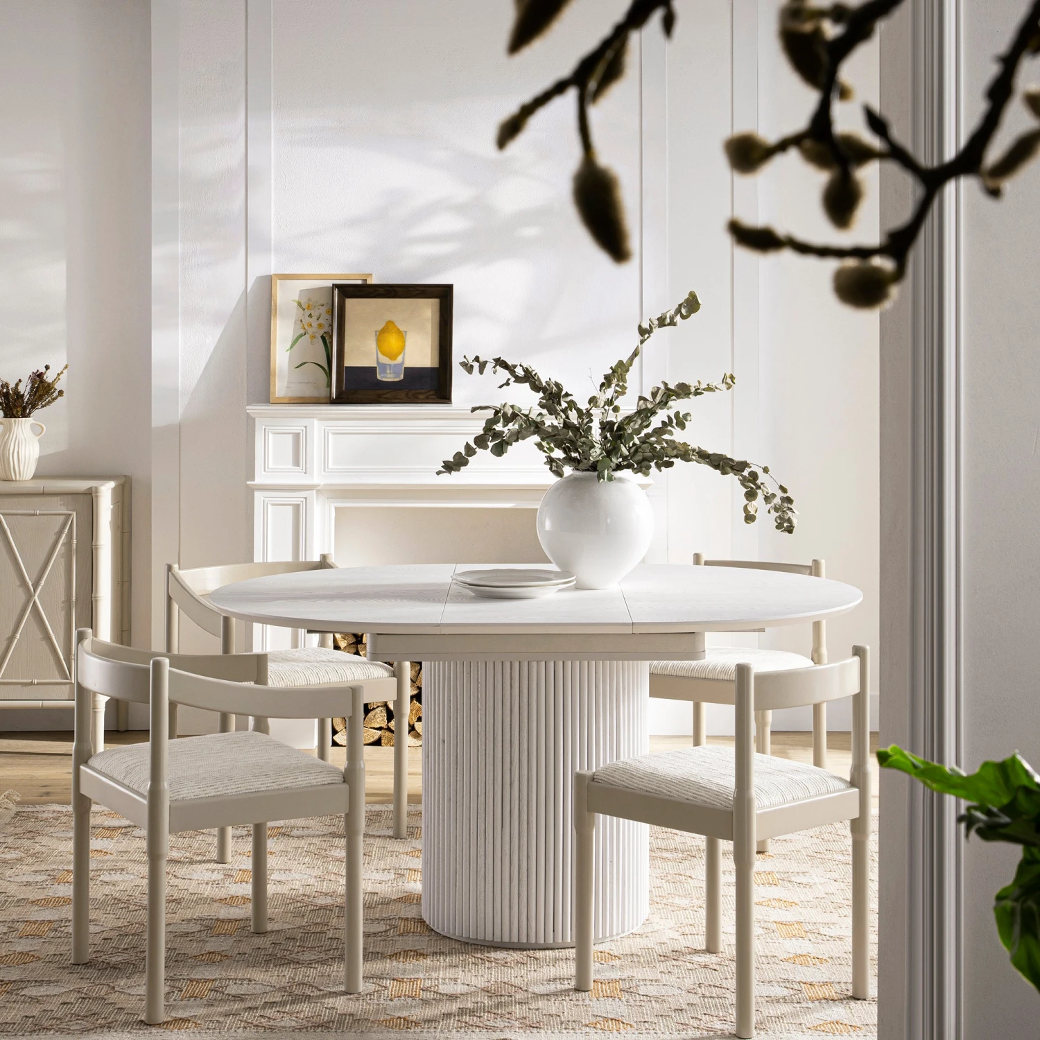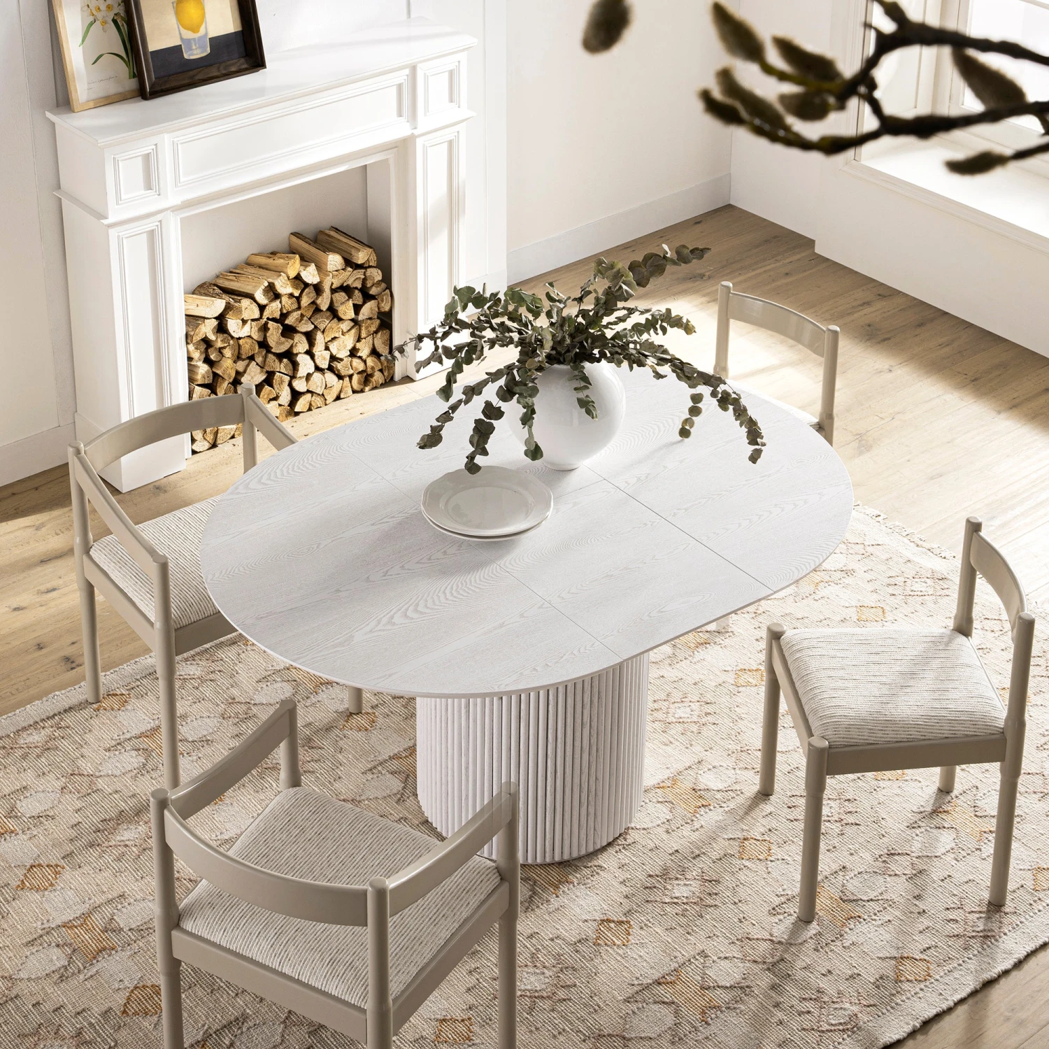 The table features a beautiful washed white finish that enhances the organic beauty of the solid oak and oak veneer. Because we use natural materials, each tabletop displays unique grain patterns and knots, ensuring your furniture is a one-of-a-kind piece of art. The rounded edges and light-toned palette bring an airy, spacious feel to your dining area.