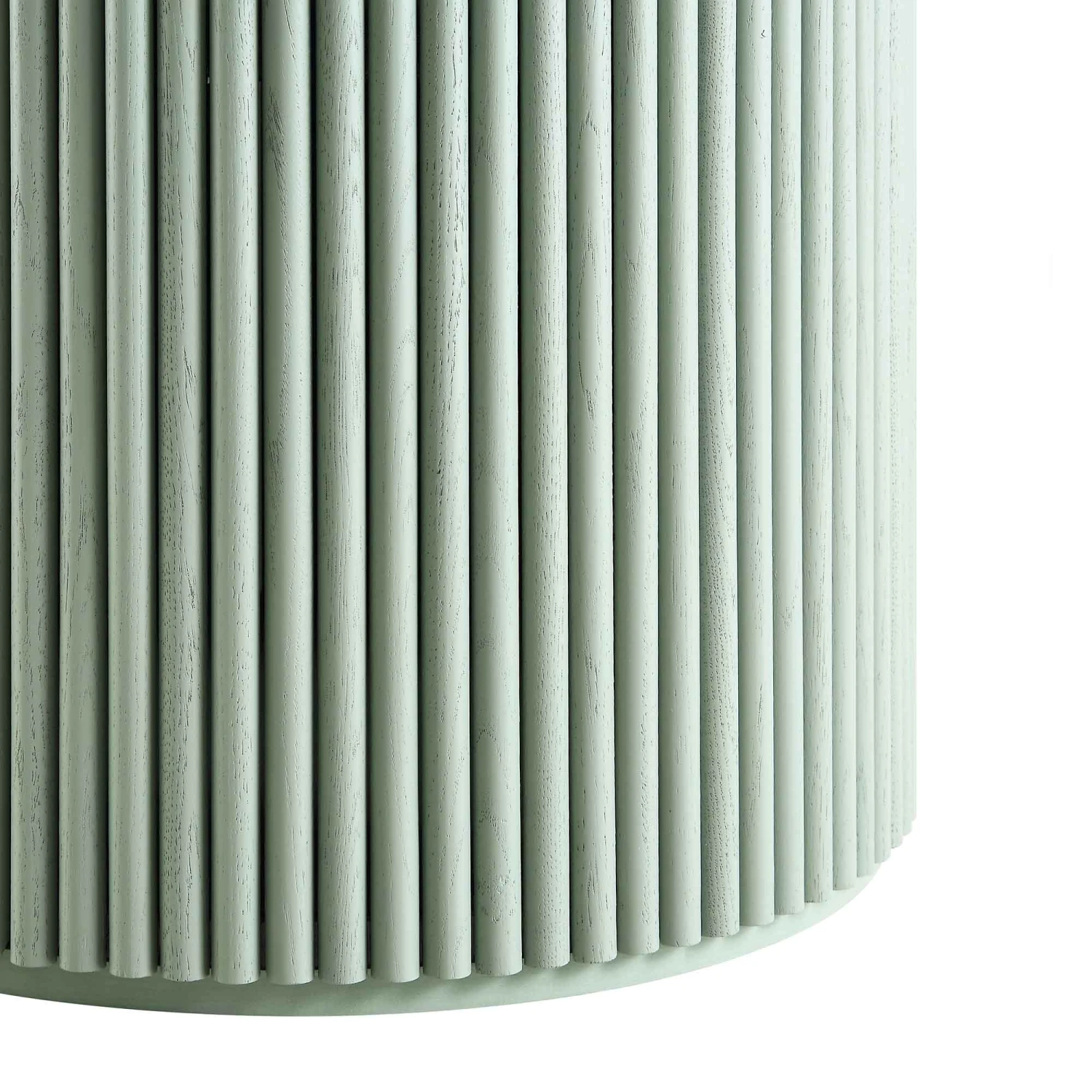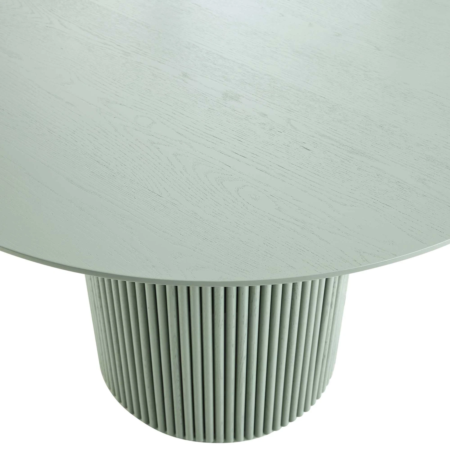 Crafted with a focus on texture and form, the table features a striking fluted pedestal base made from solid oak, providing both stability and a high-end architectural feel. The 110cm circular top is finished with high-quality oak veneer, allowing the unique natural grains and knots of the wood to peek through the sage green paint for an organic, artisanal look.