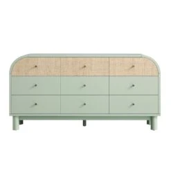 - The softly rounded form is paired with a soothing green matte painted finish and contrasted by three raffia-fronted top drawers, adding natural texture and warmth.