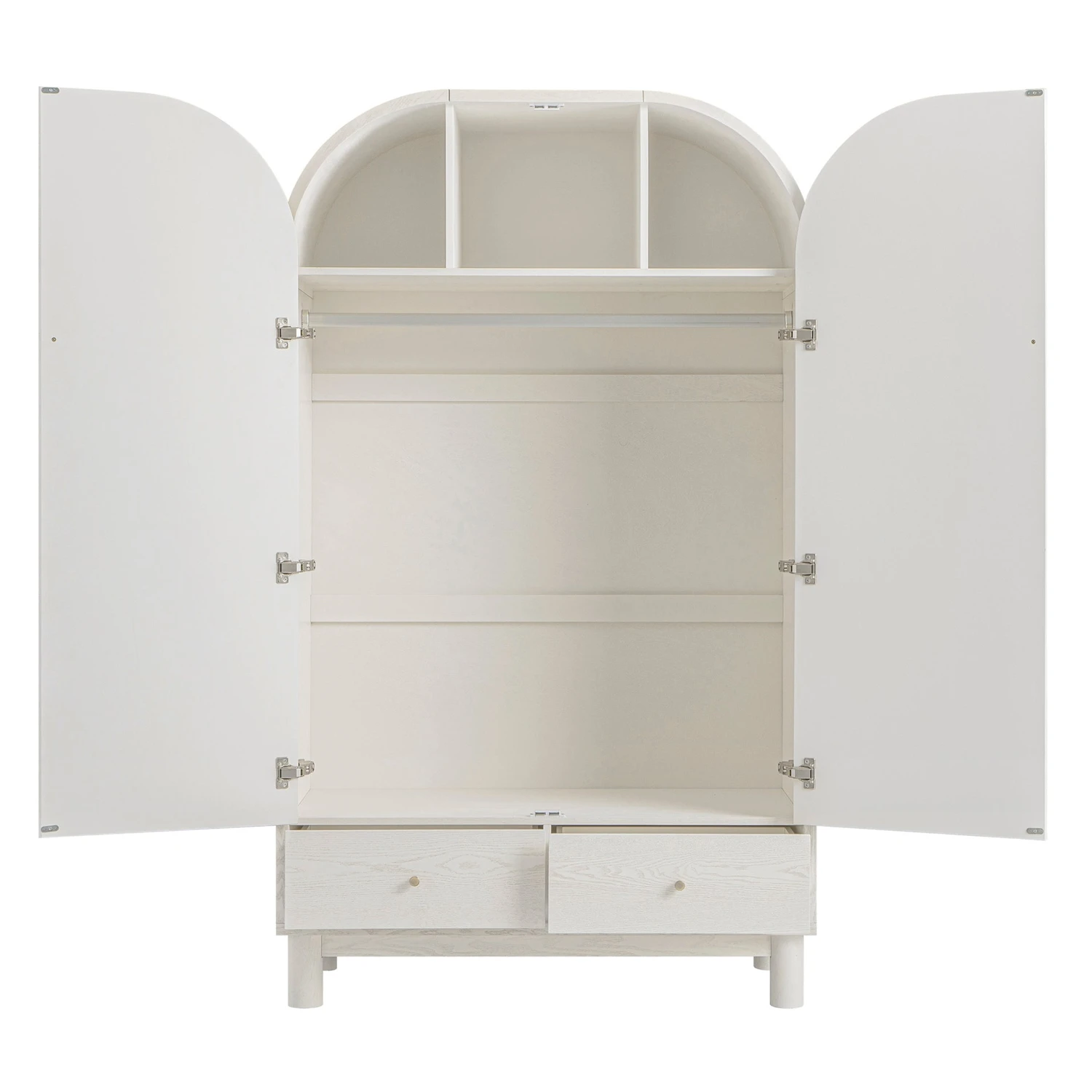 - The full-height doors open to reveal a spacious hanging rail and upper cubbies for accessories or seasonal storage, while two lower drawers offer additional space for folded clothing or linens.