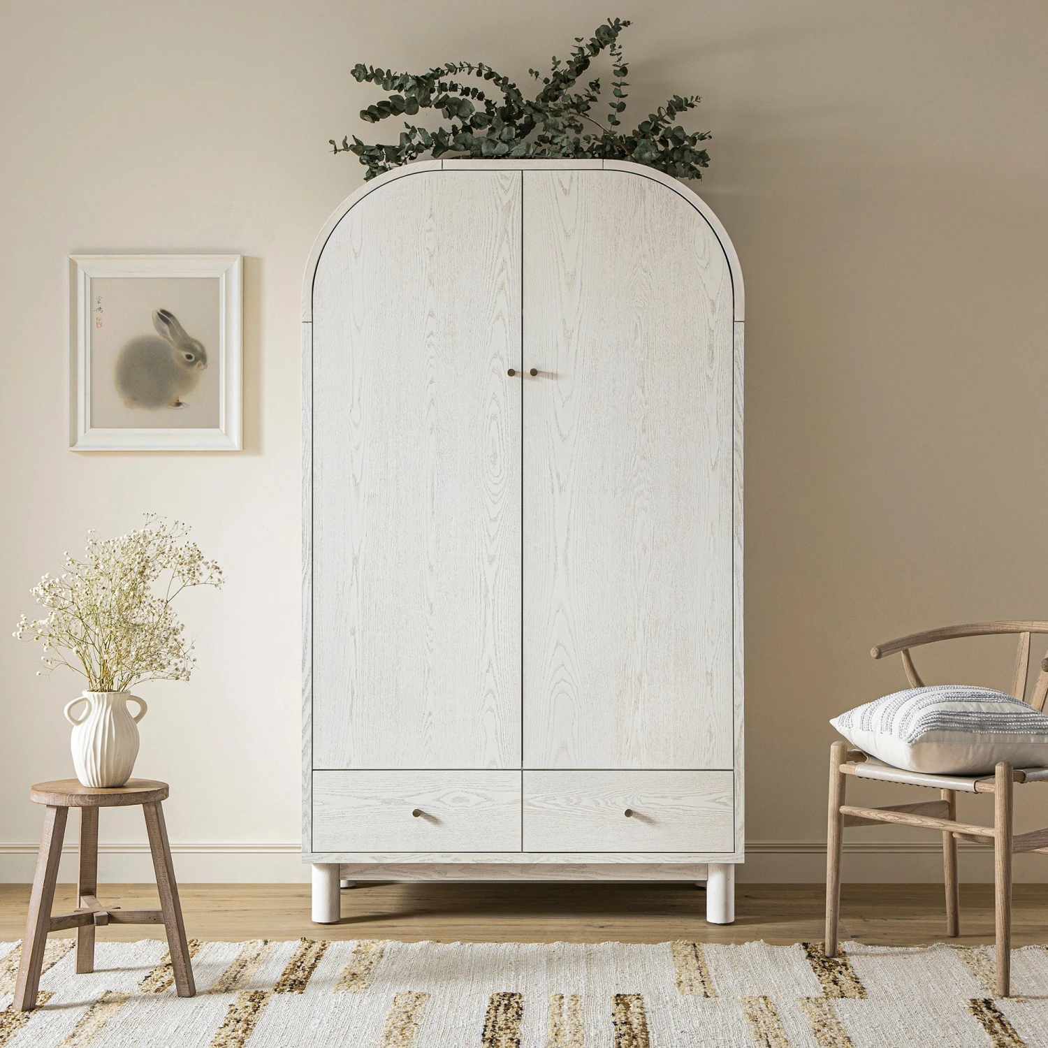- Complete the look: Pictured with the Maude Washed White Ash Double Wardrobe is our Noa Linear Cream Handwoven Wool Rug, Hansel Light Grey Faux Leather Elm Dining Chair and Indigo Laguna French Knot White & Blue Cushion.