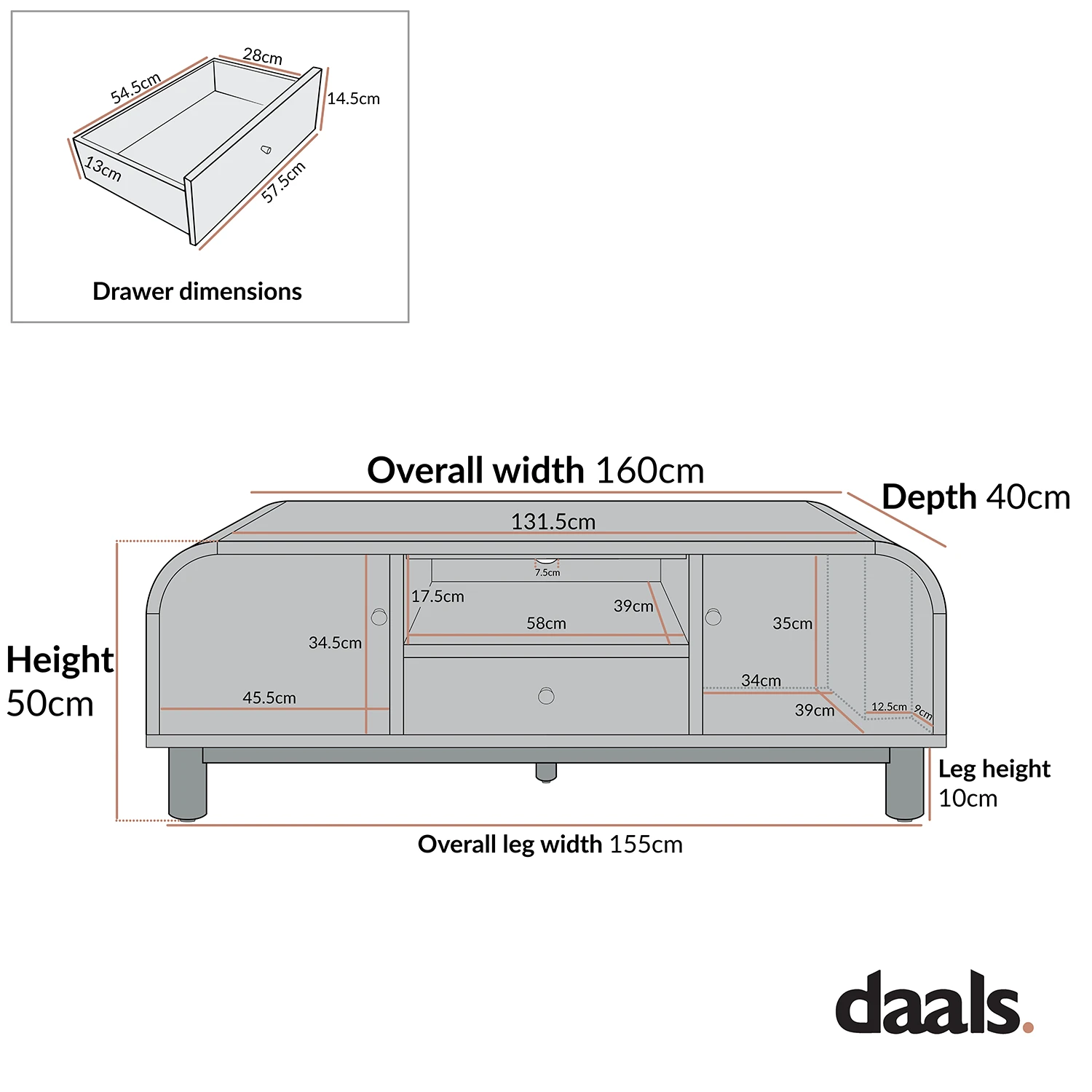 - Drawer internal storage space: W 54.5 x D 28.0 x H 13.0 cm